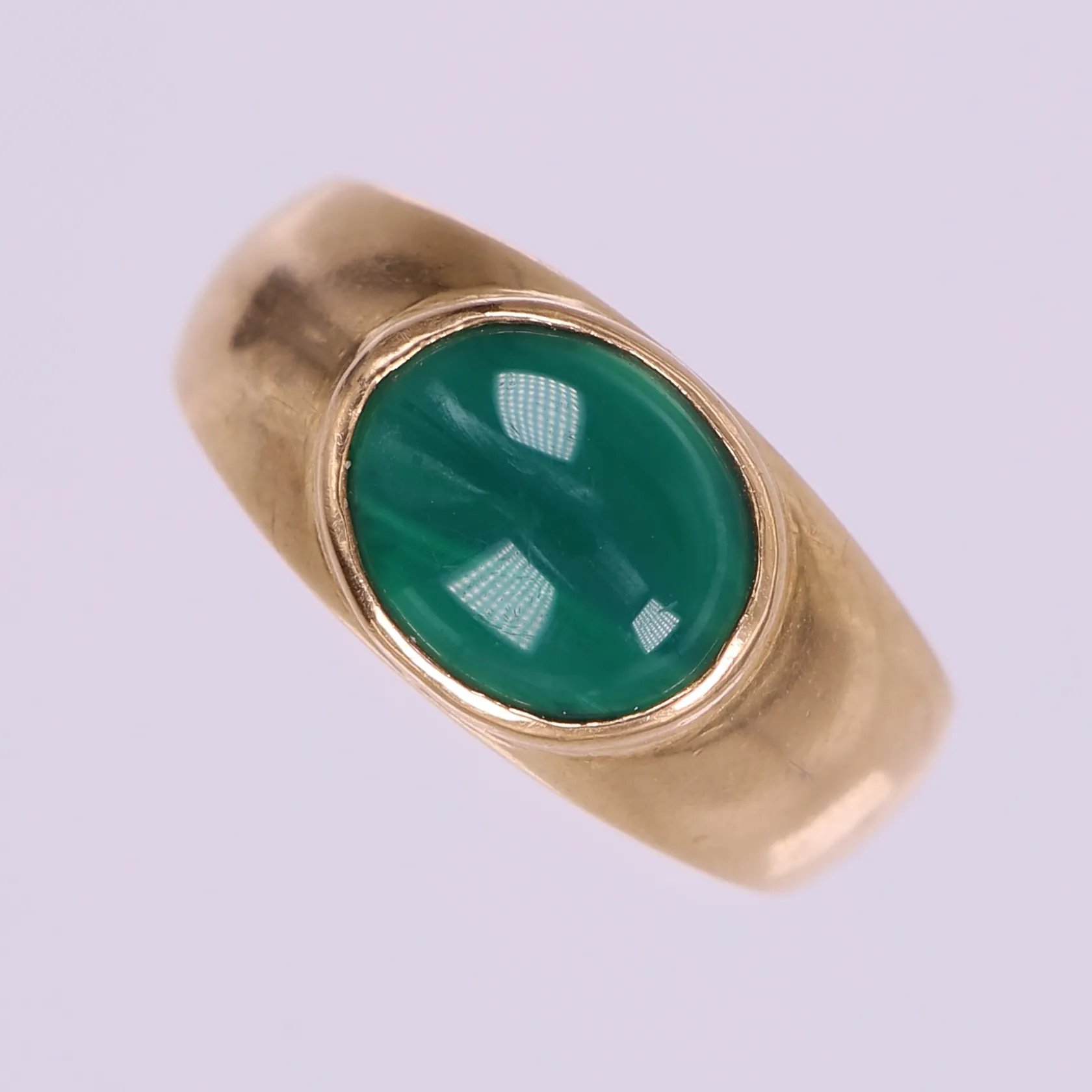 Klackring med cabochonslipad grön sten, stl 20½, bredd 5-11mm. 18K Vikt: 12,1 g.