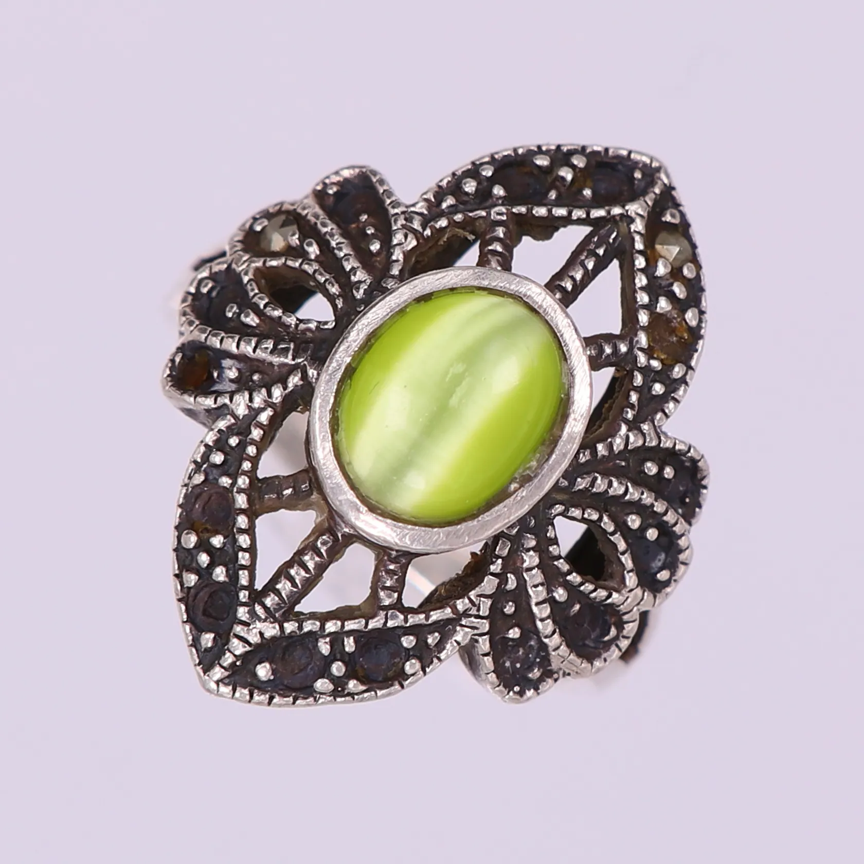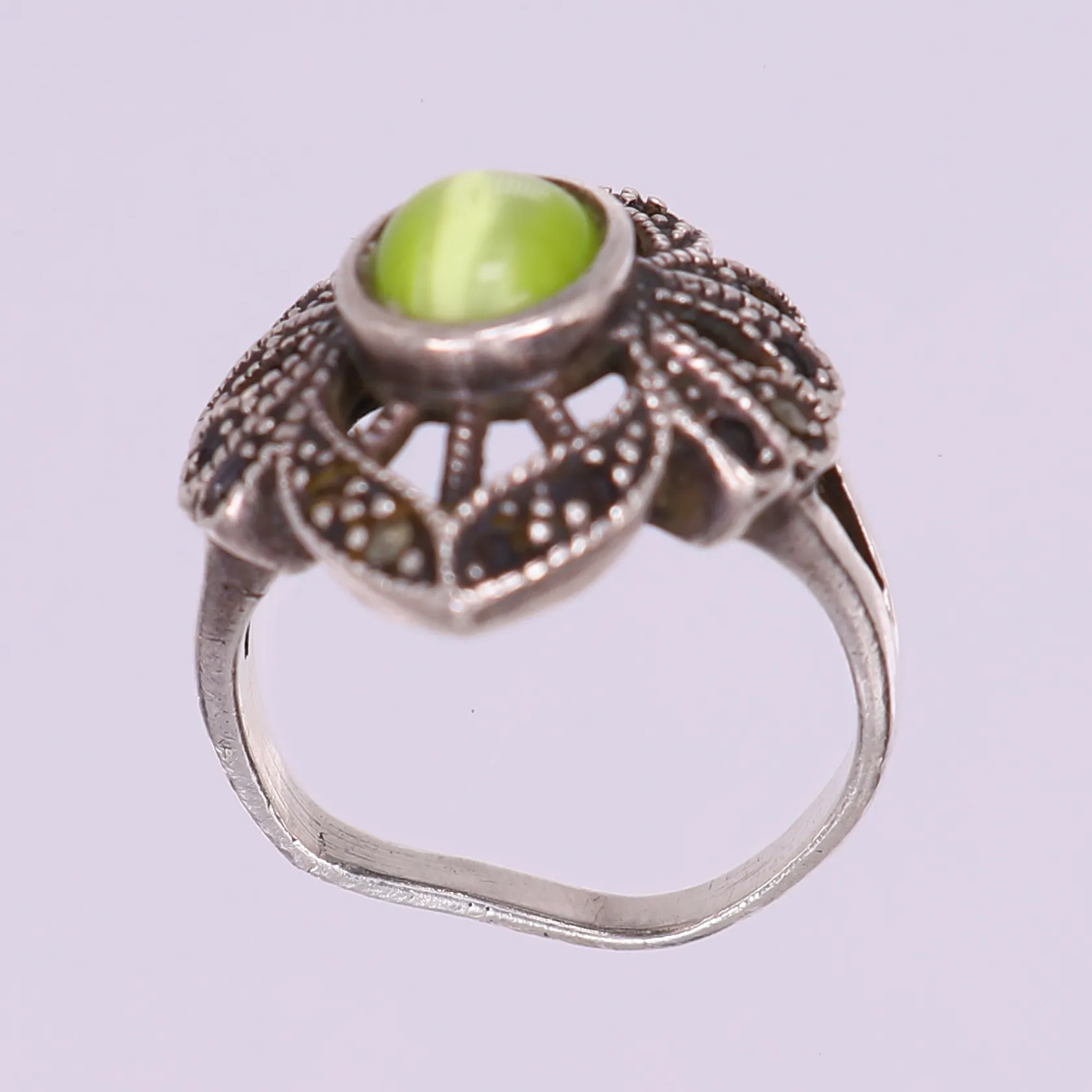 Ring med grön sten samt markasiter, stl: 17½, bredd 2,5-25mm, stenar saknas, bucklig skena, silver 925/1000. Vikt: 6,6 g.