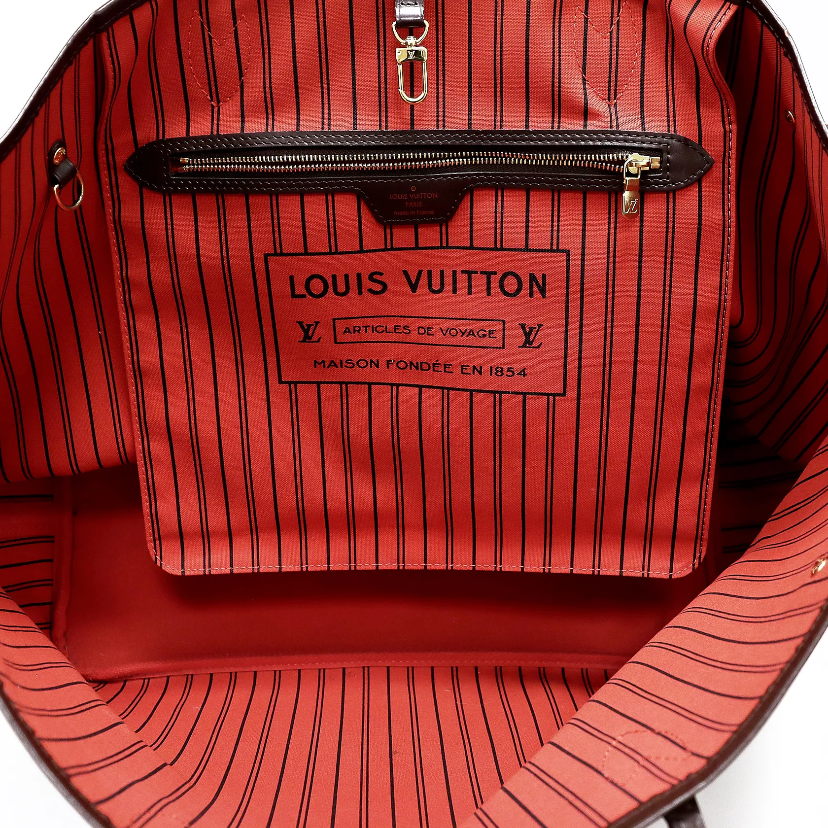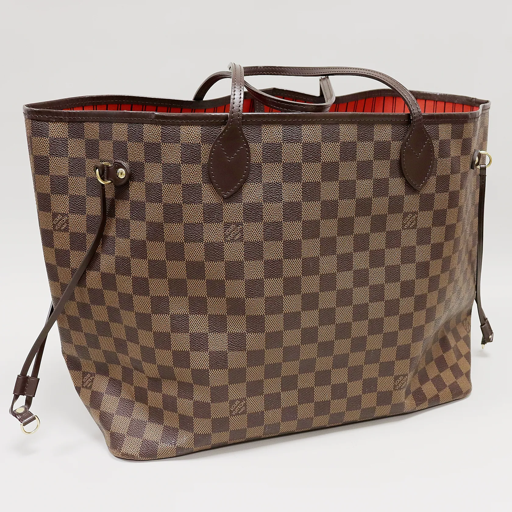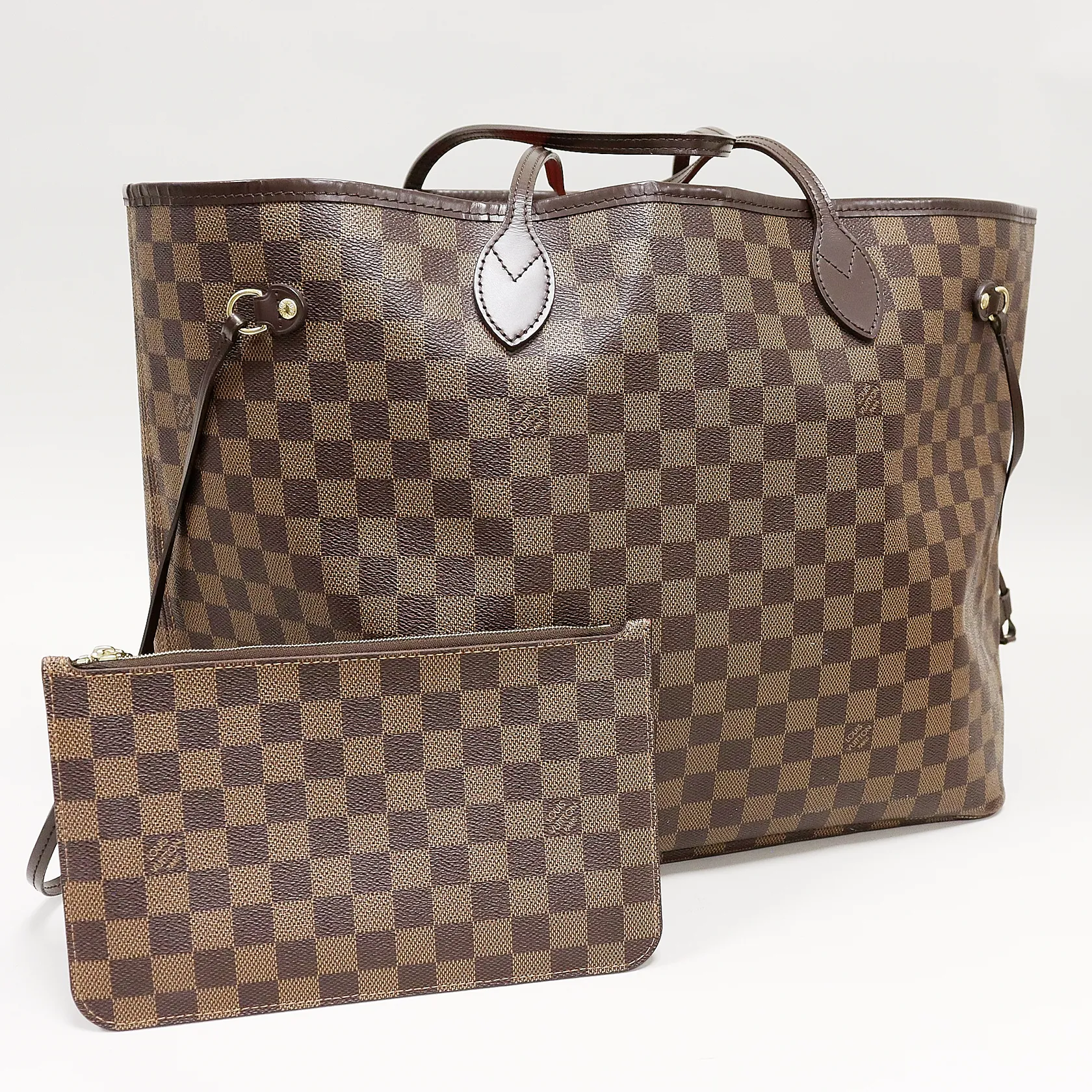 Väska Louis Vuitton, Neverfull GM, N41357, Damier Ebene, datumkod FL3176, ca 40x32x20cm, tillhörande clutch, beslag i gulmetall, rödrandigt innerfoder, lätt slitage på yttre bottenhörn samt på övre kant, övrigt i åldersbetingat gott skick, kvitto Louis Vuitton Köpenhamn Oktober 2016, dustbag, box med defekter.
