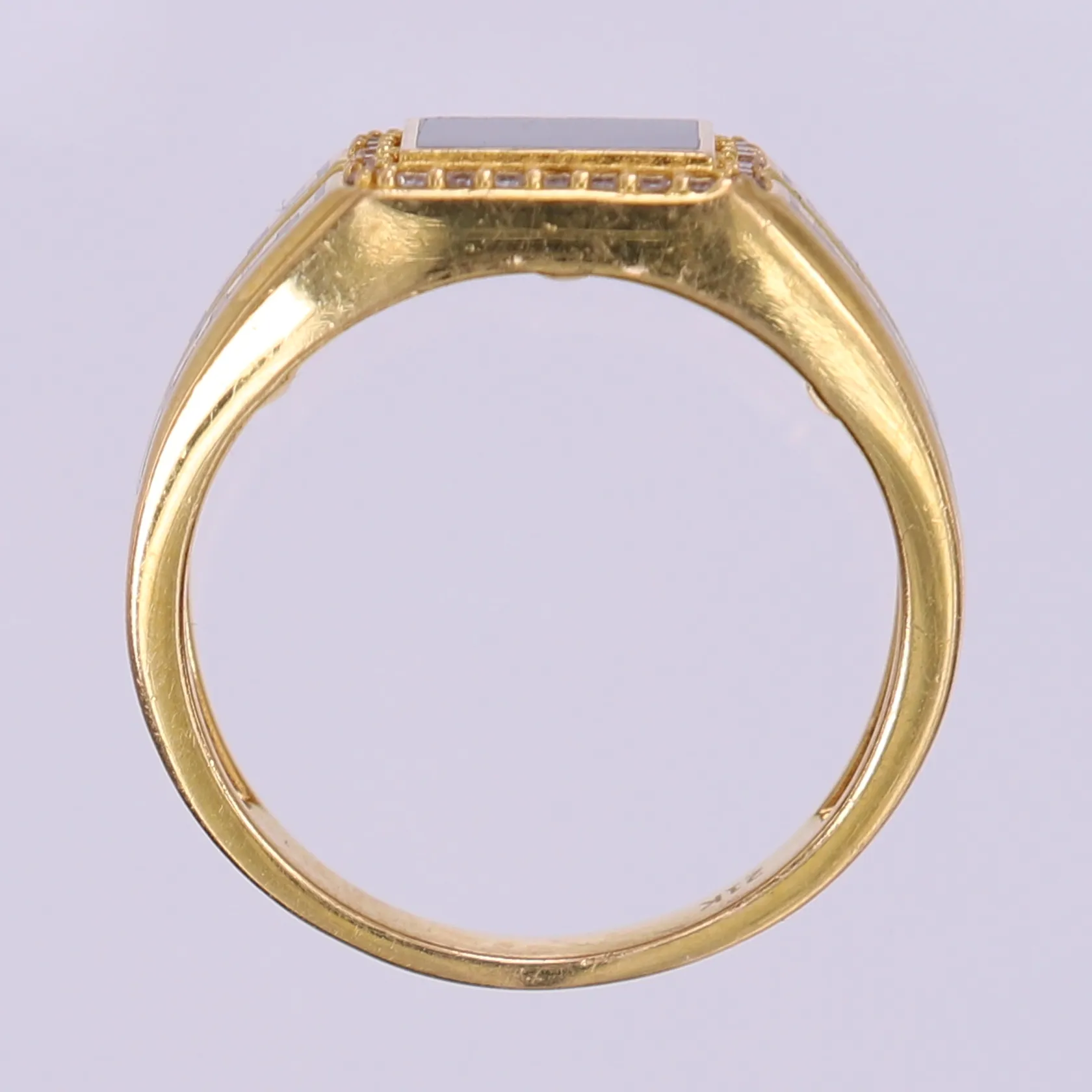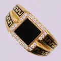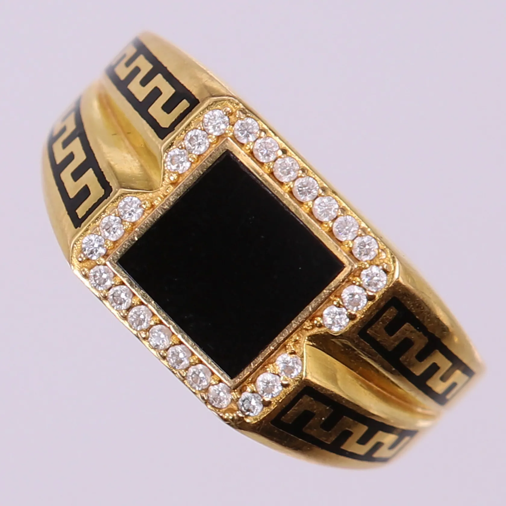 Ring med vita och svart sten, dekor i meandermönster, stl: 19½, bredd 3,5-11,5mm, 21K. Vikt: 10 g.
