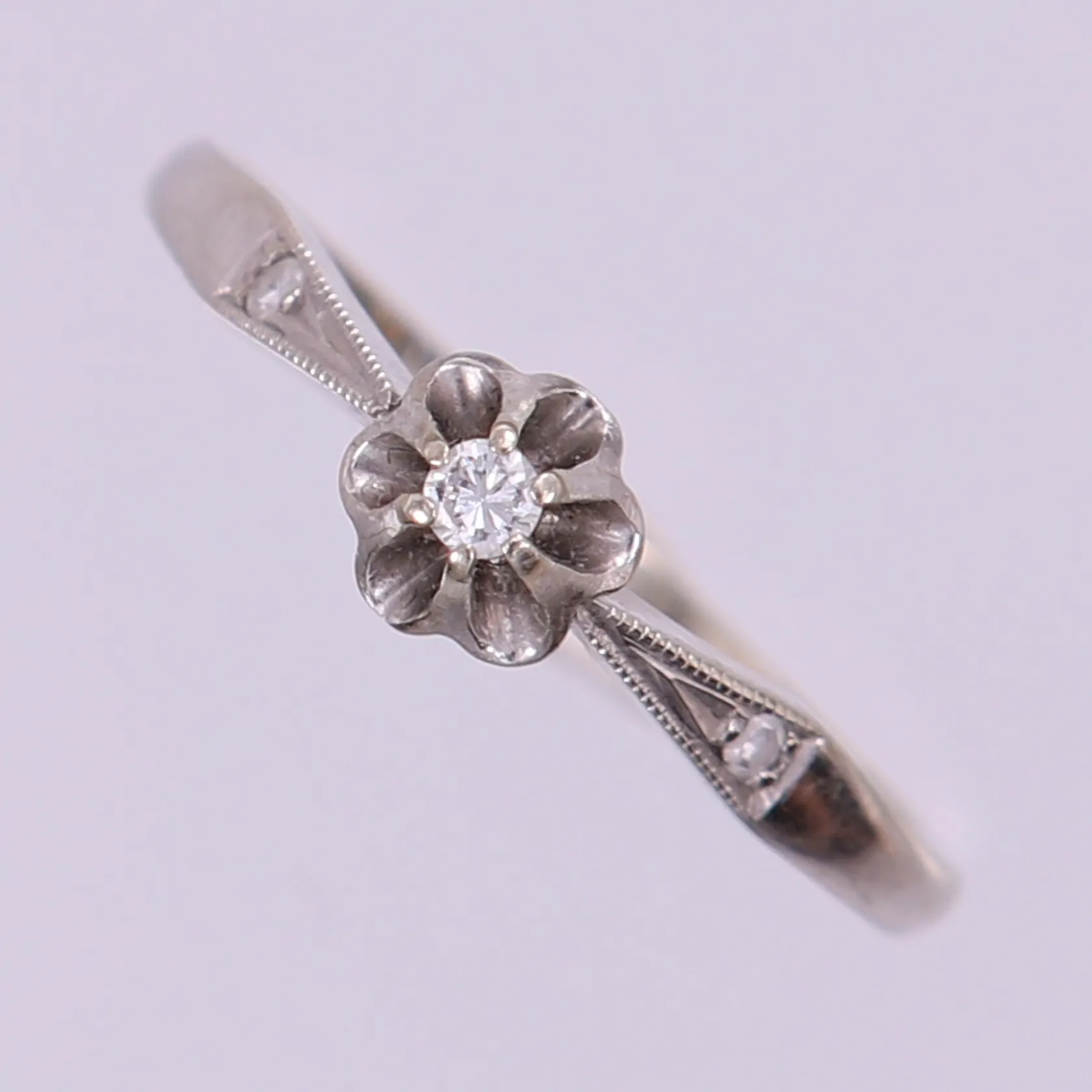 Ring med briljantslipad diamant 1 x 0,03ct, 8/8-slipade diamanter 2 x 0,01ct, stl 17¾, bredd 1,5-5,5mm, vitguld 18K. Vikt: 2,1 g.