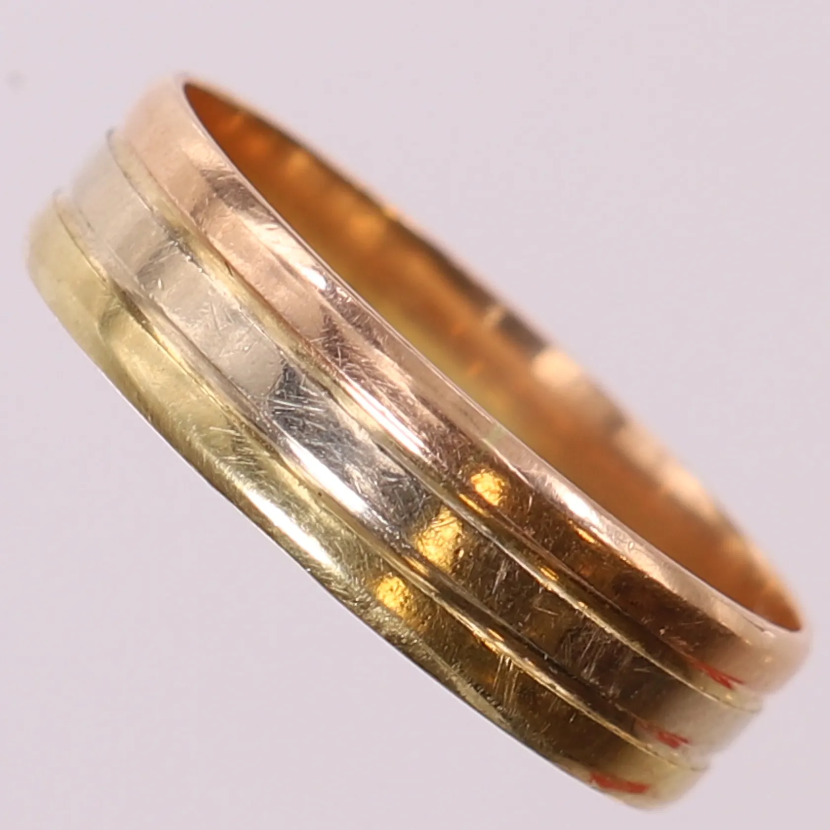Ring, stl: 21, bredd 6mm, trefärgat guld, 14K. Vikt: 3,9 g.