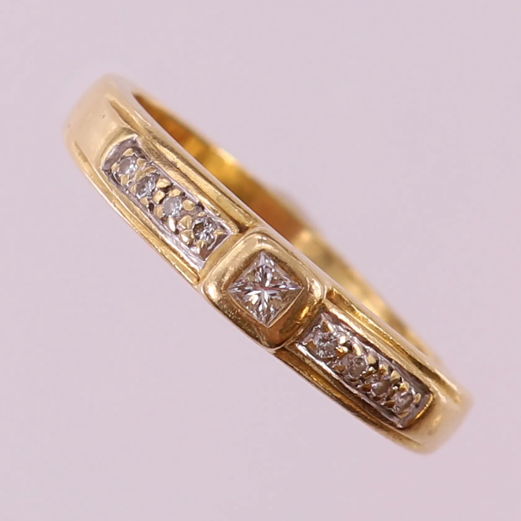 Ring med prinsesslipad diamant 1 x ca 0,05ct, briljantslipade 8 x 0,01ct, stl: 19, bredd 3-4mm, 18K. Vikt: 4,6 g.