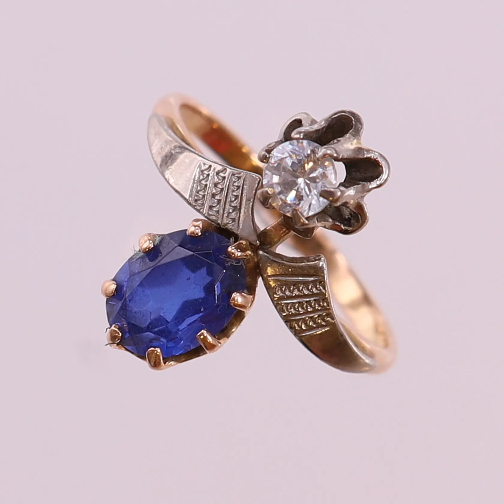 Ring tvåfärgad med vit och blå sten, stl 17½, bredd 1,5-17,5mm. 14K Vikt: 3,4 g.