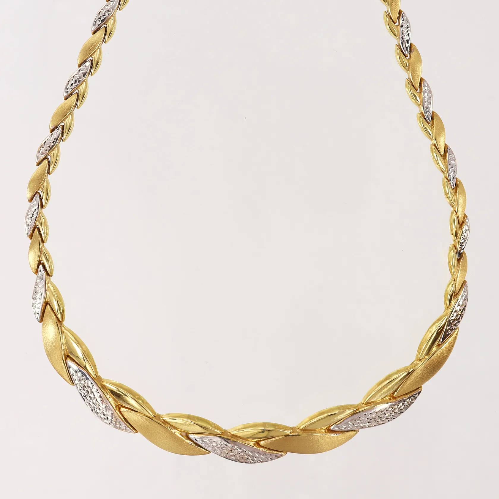Collier, doserad, halvstelt, längd 42cm, bredd 6-13mm, vitguldsdetaljer, ihåligt, 18K. Vikt: 23 g.