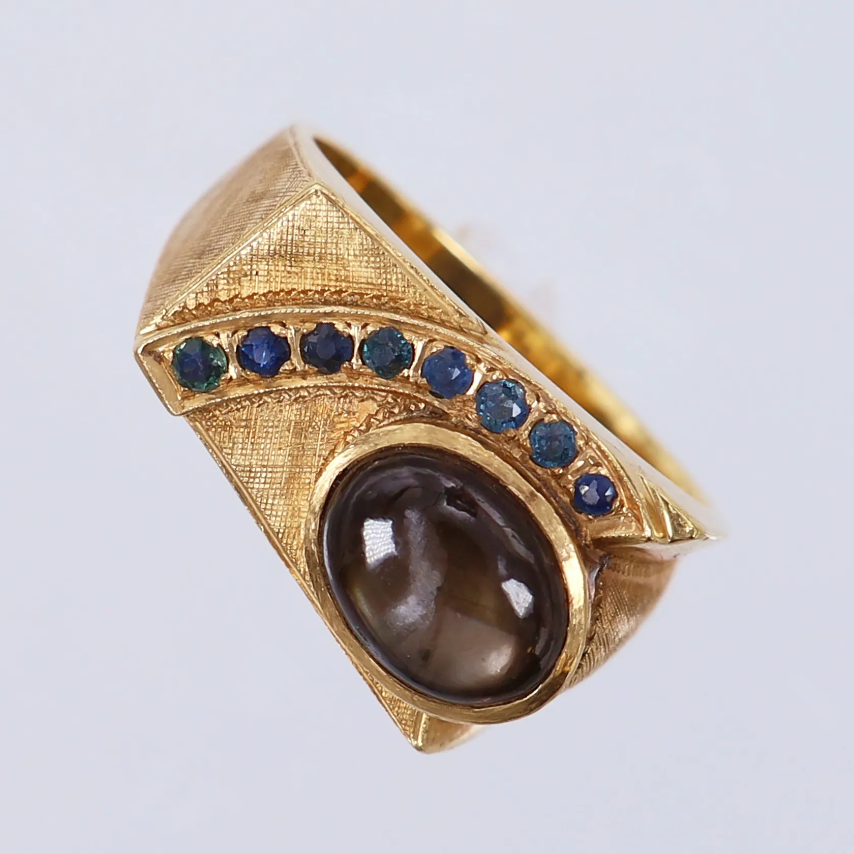 Ring med troligtvis safirer och brunsten, stl 19, ca bredd 4,5-12,8mm. 14K Vikt: 14,1 g.
