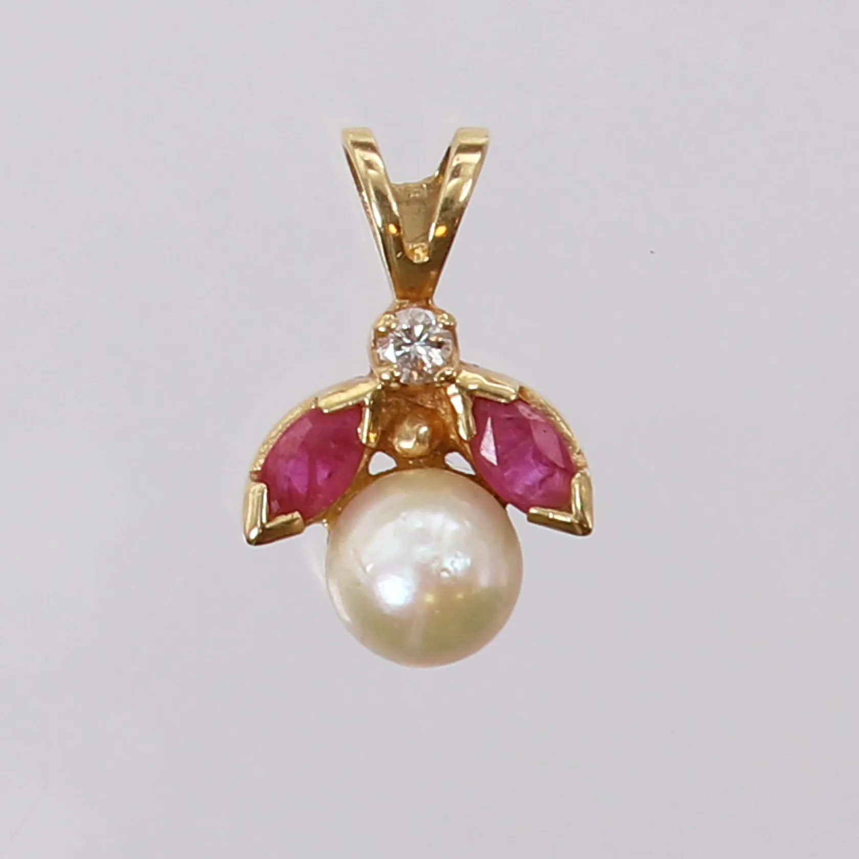 Hänge med 8/8-slipad diamant 0,02ct, rubiner och odlad pärla, ca 14x9mm inkl ögla. 14K Vikt: 1 g.