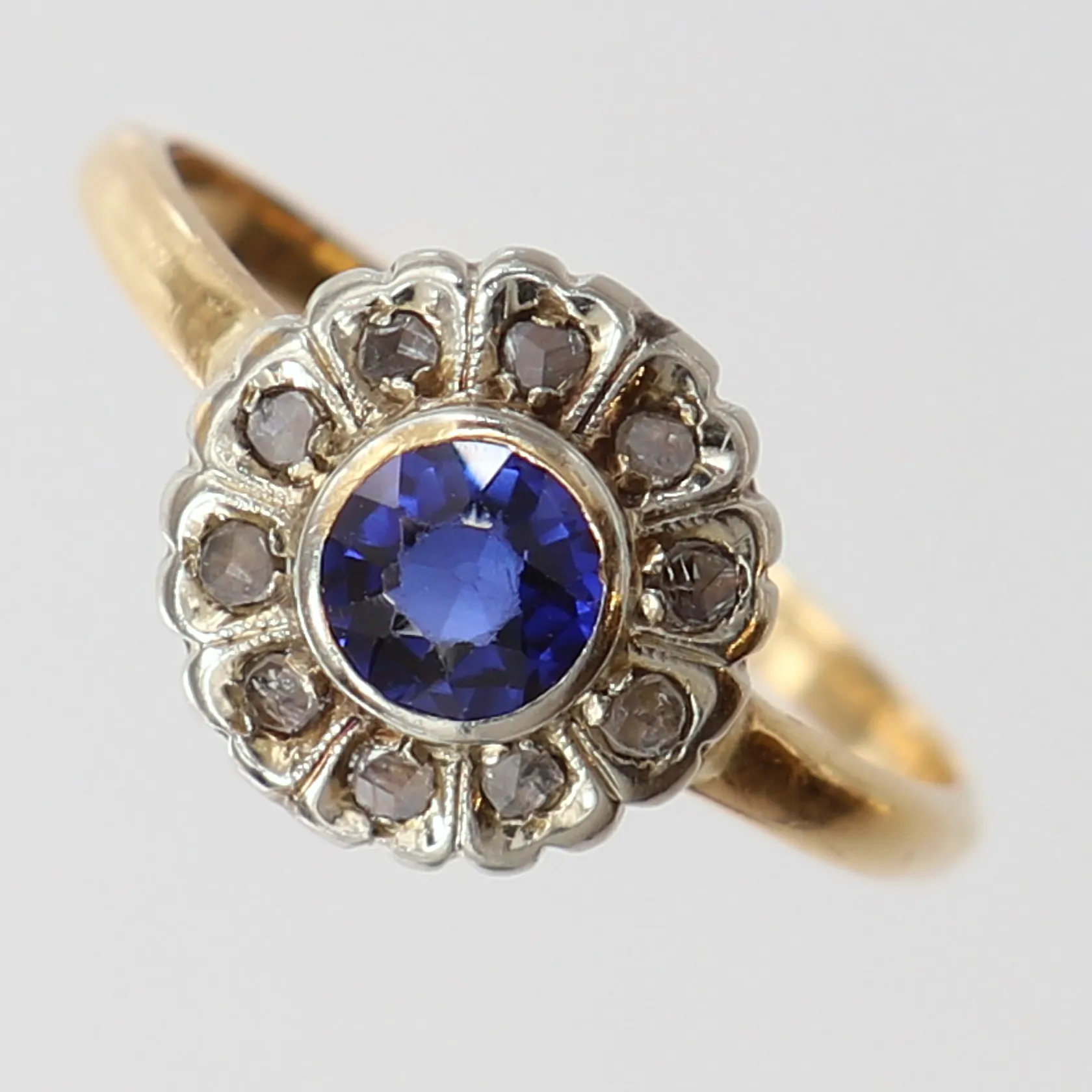 Ring med safir samt rosenslipade diamanter ca 10 x 0,01ct, stl 17¾, bredd ca 2-11mm, slitna fasetter, bucklig, 18K Vikt: 2,1 g.