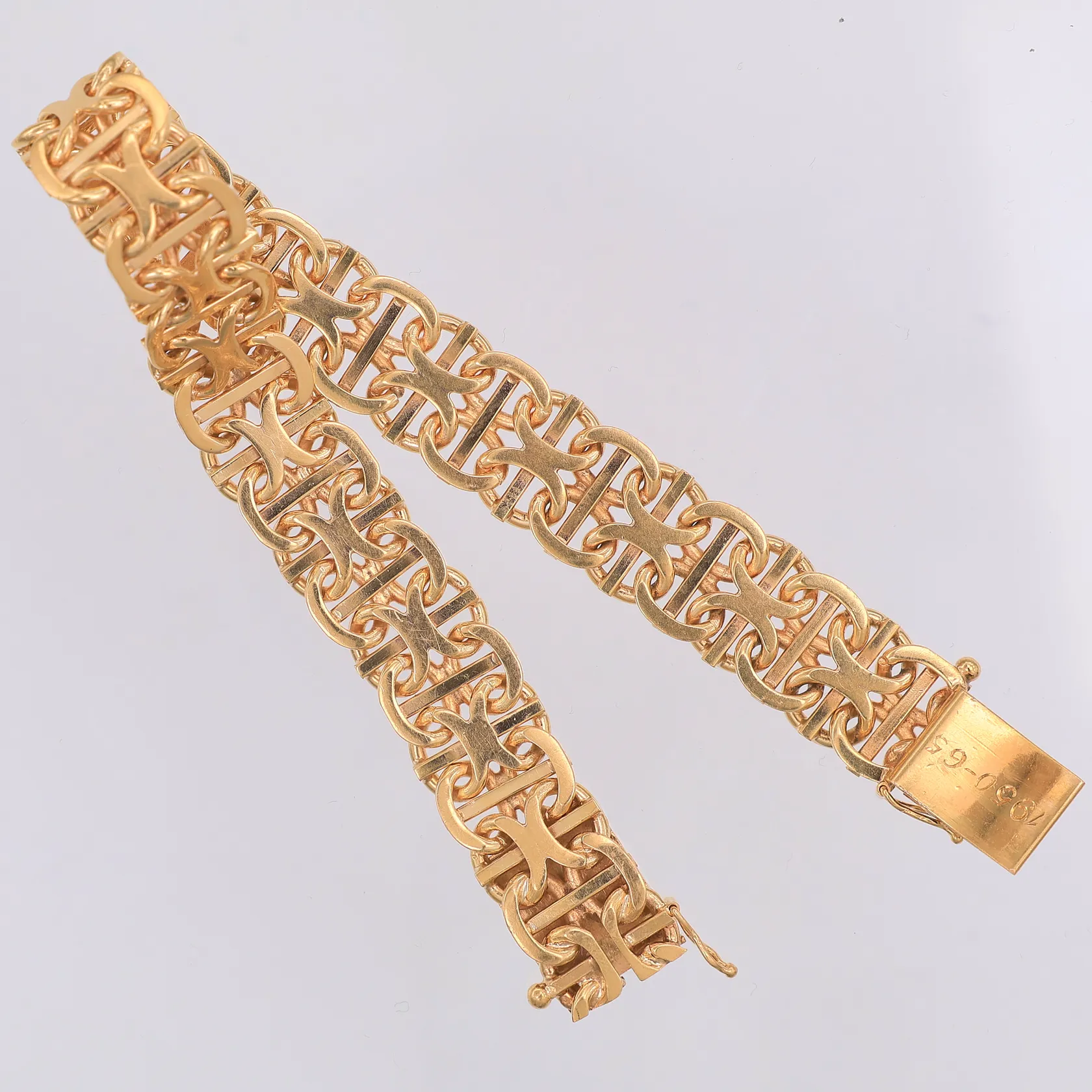 Armband, X-länk med stav, 19,5cm, bredd 11,5mm, Svenska Guldvaru AB år 1964, 18K Vikt: 35,4 g.