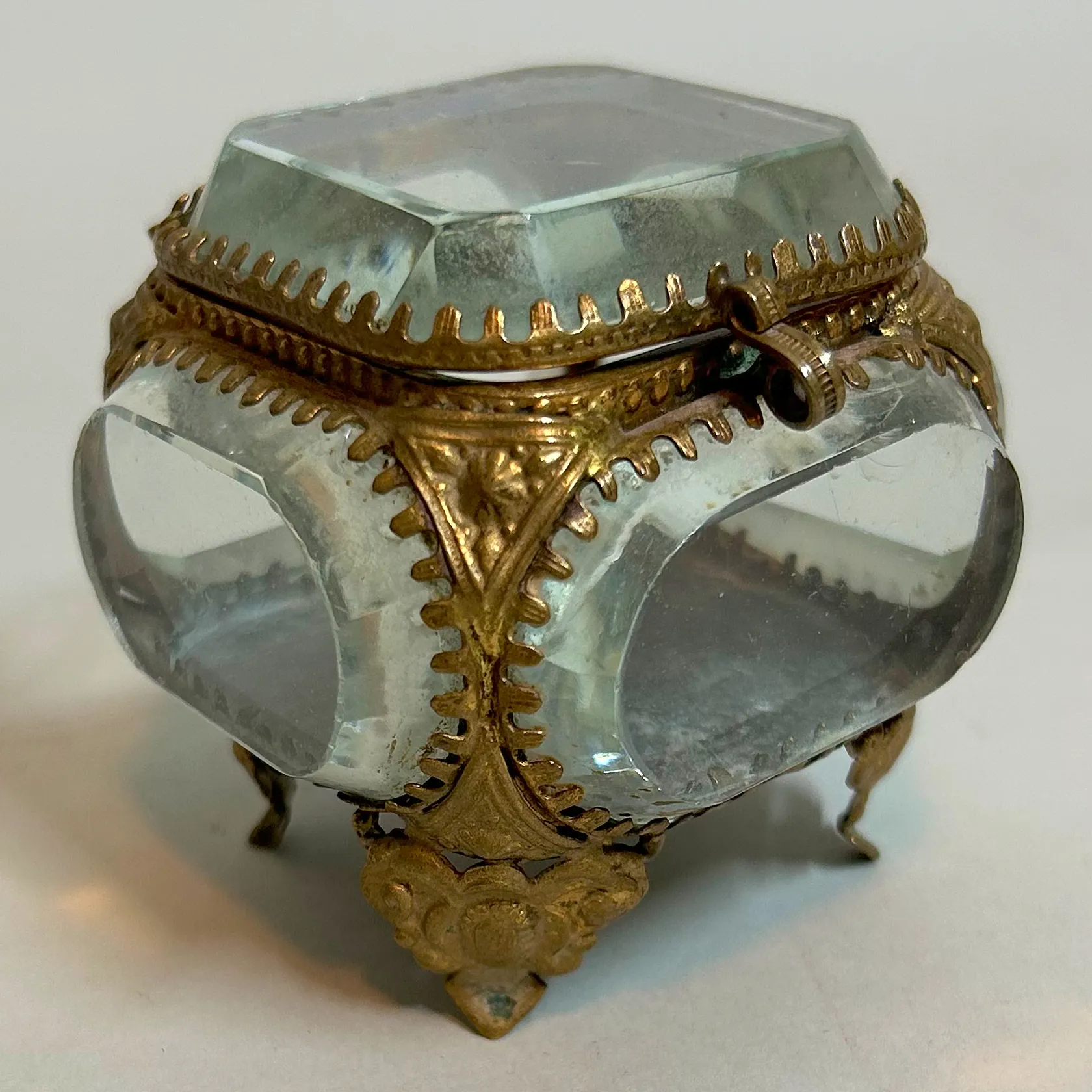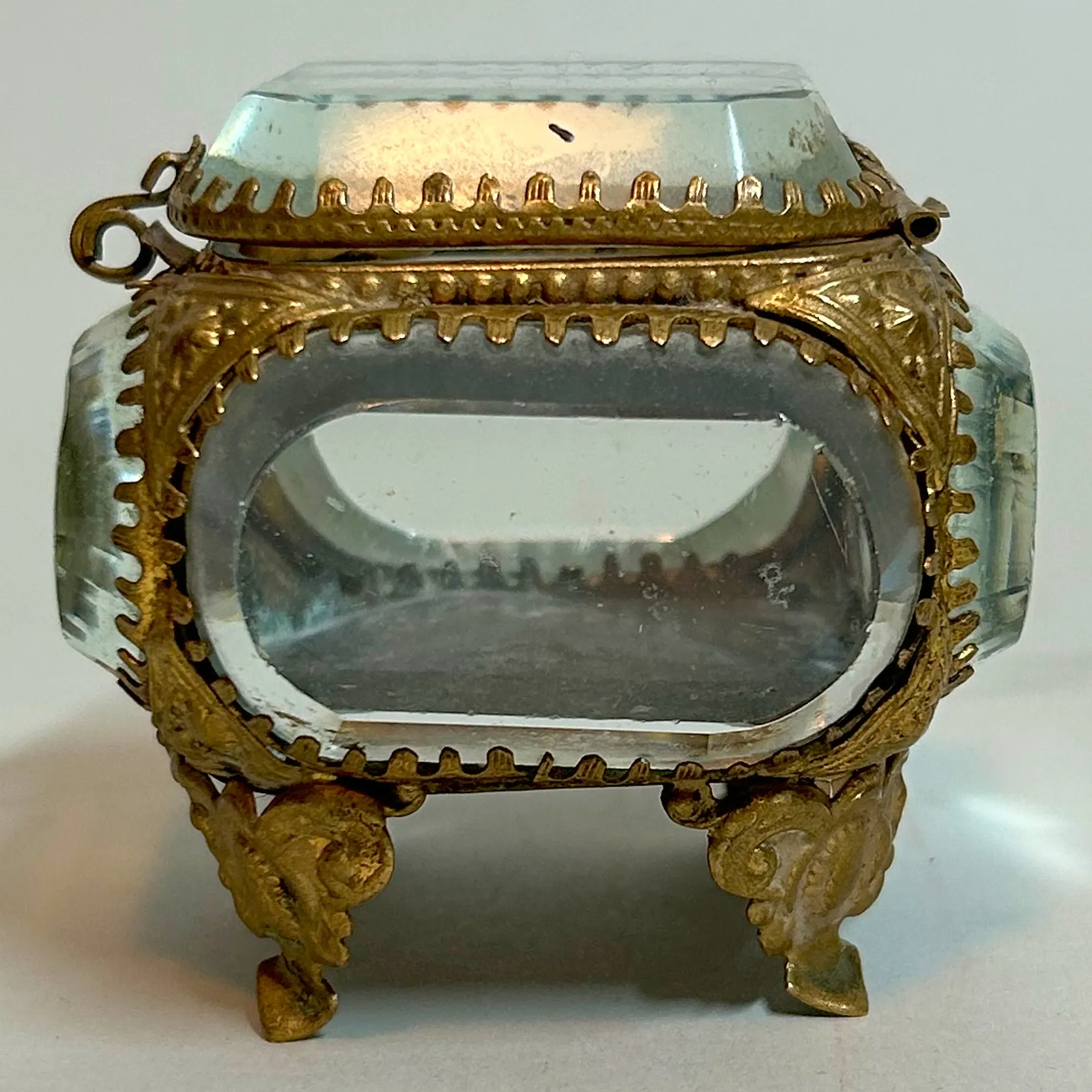 Smyckesskrin modell Napoleon III, glas, 65 x 63mm, ett glas chippat, nån repa, förgylld mässing