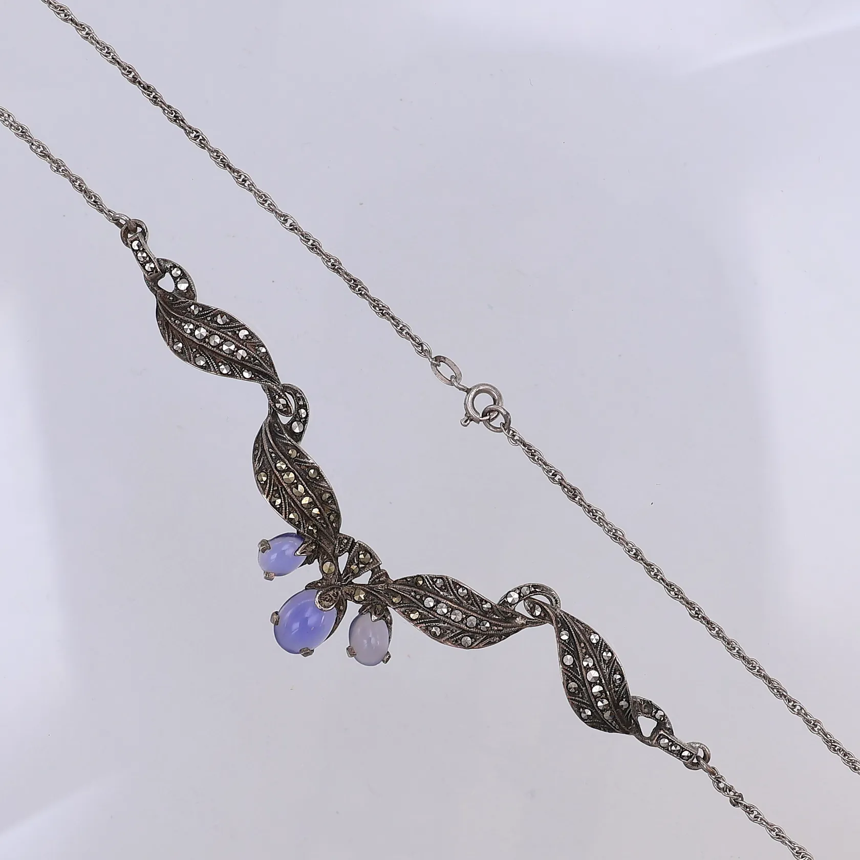 Collier, kalcedon, markasiter, 42,3cm, hängdel 10 cm, bredd 8-18mm, en markasit saknas, 835/1000 silver Vikt: 12,5 g.