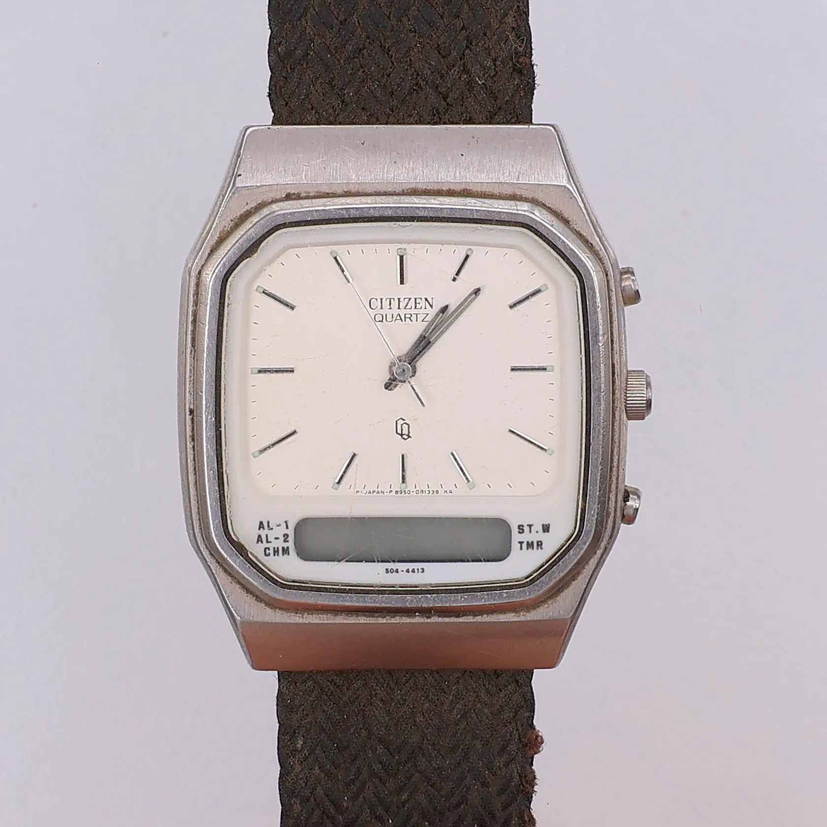 Herrur Citizen, quartz, analog/digital, 30mm, 70-tal, står still, smårepigt glas, smutsigt tygband