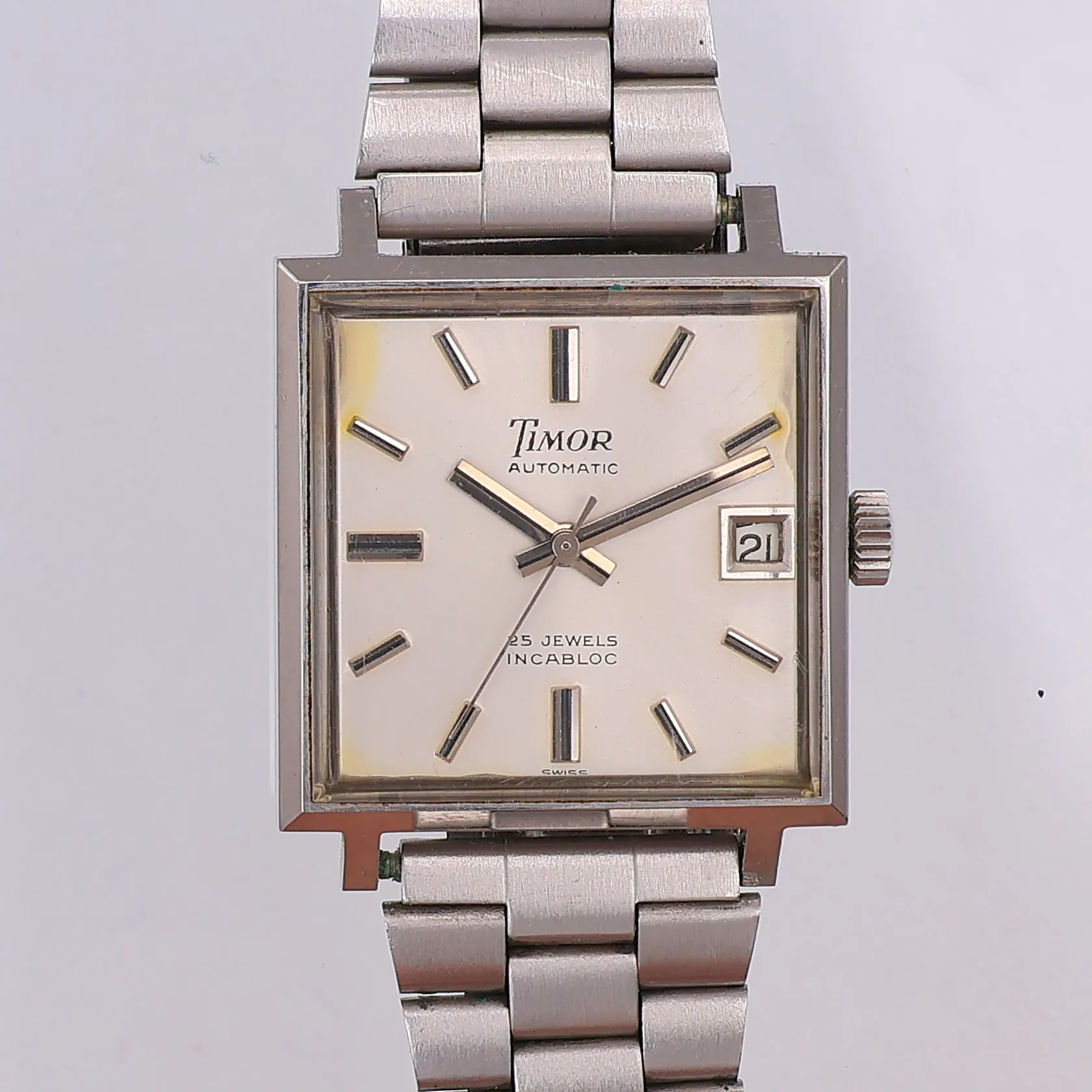 Herrur Timor, automat, 30mm, 70-tal, viklås, ca 20cm, stål, missfärgning i ett hörn av urtavlan