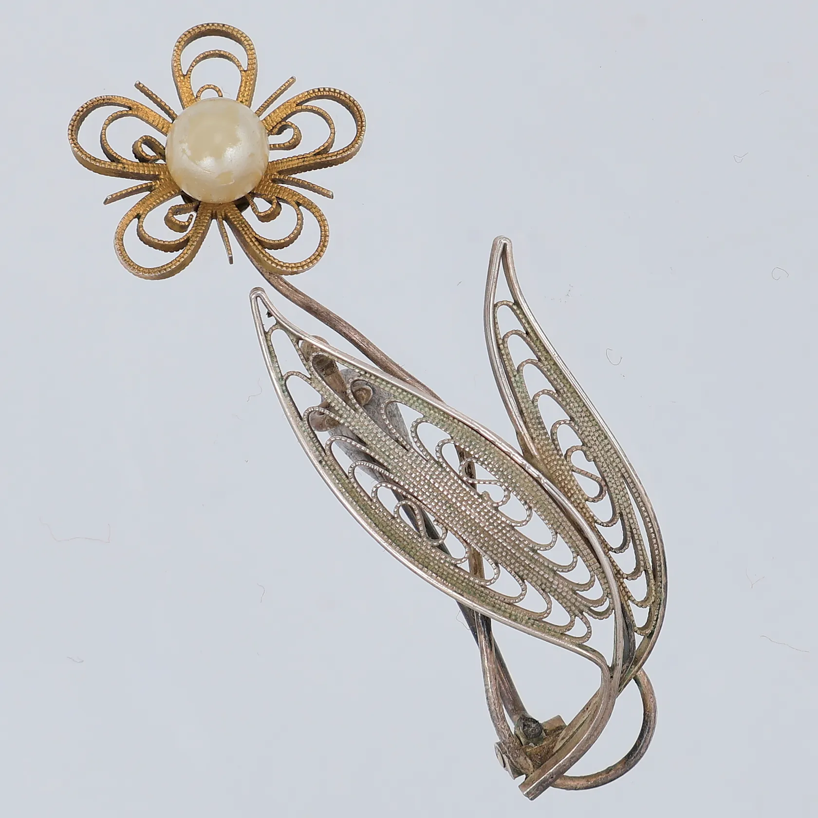 Brosch, filigran, plastpärla, 50mm, Helsingfors, 813/1000 silver Vikt: 3,2 g.
