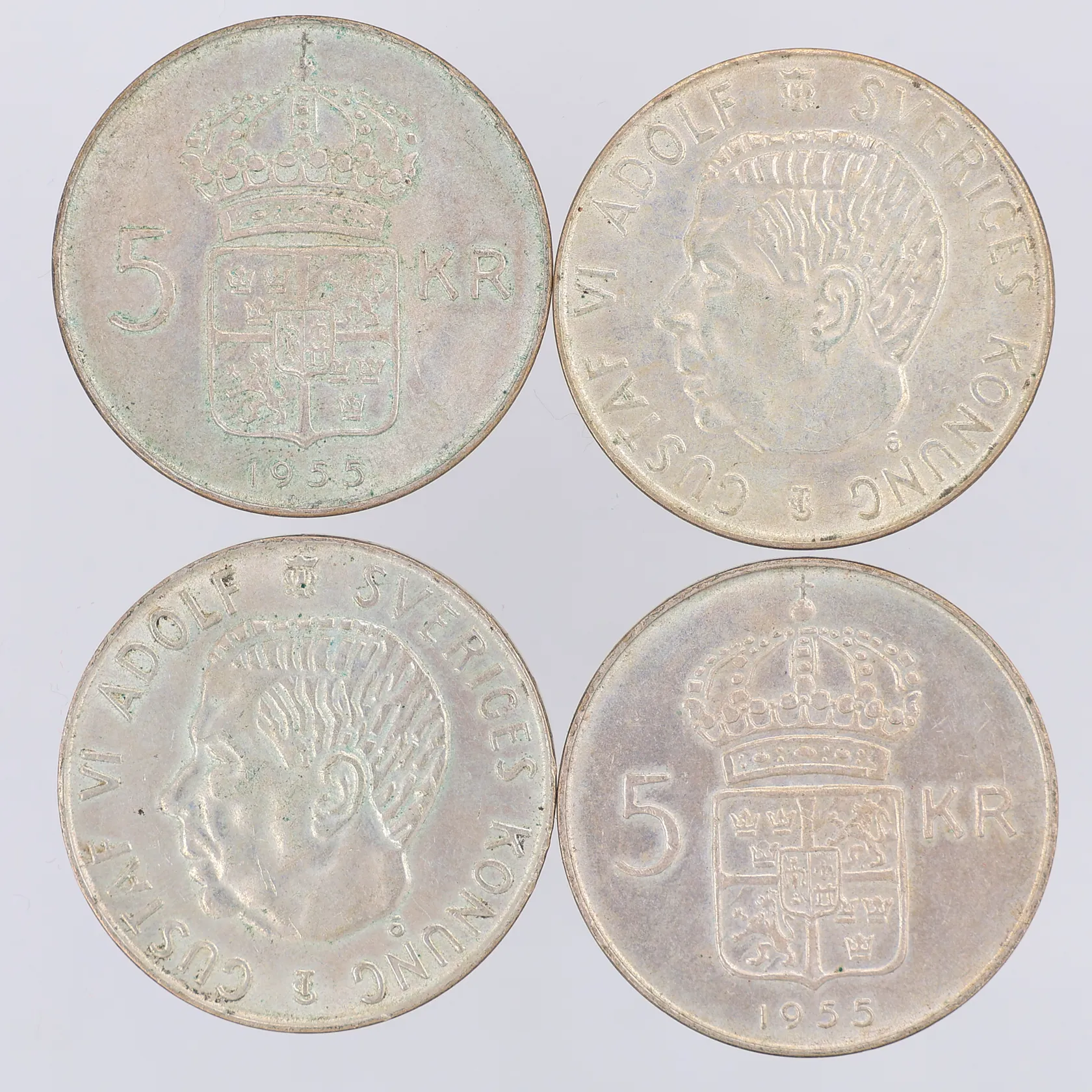 4 Mynt Gustaf VI Adolf, nominellt värde 5 kr, år 1954-55, 400/1000 silver Vikt: 72,1 g.