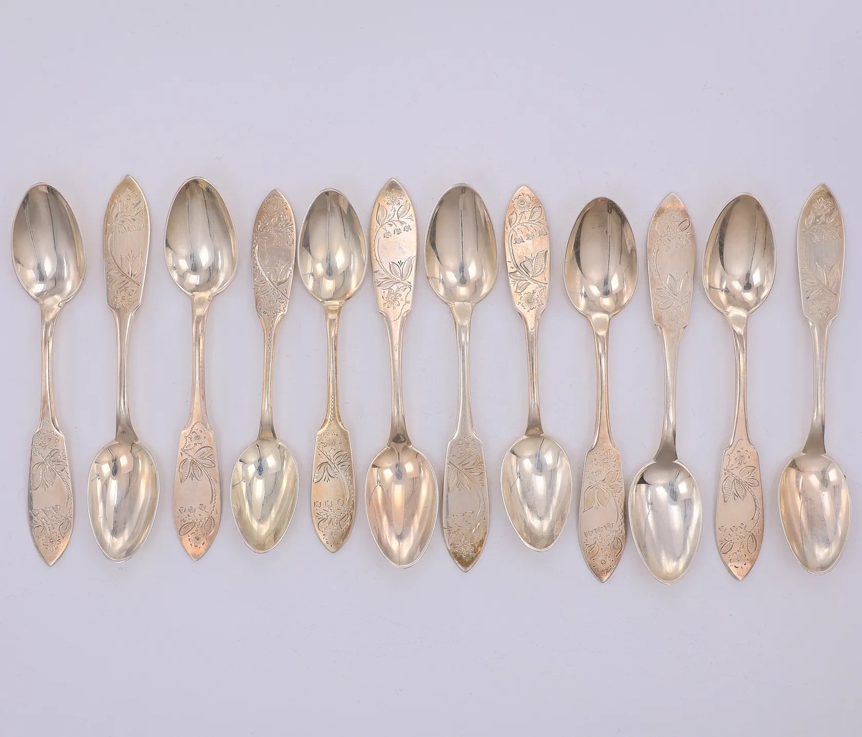 12 Kaffeskedar, modell Tornedal, 12-12,5cm, Haparanda år 1958-76, gravyr, 830/1000 silver Vikt: 178,4 g.