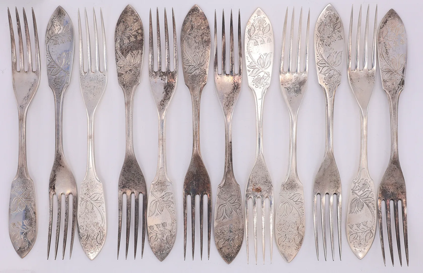 12 Bordsgafflar, modell Tornedal, 18cm, Haparanda år 1976-78, 830/1000 silver i tyglinda Vikt: 432,5 g.