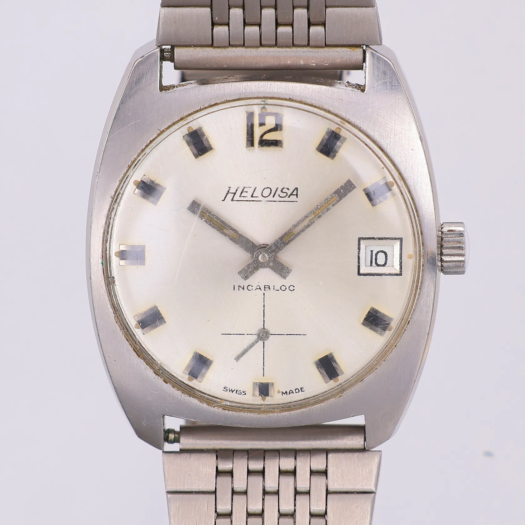 Herrur Heloisa, manuell, datum, 33,5 x 33mm, stål, 70-tal, armband, stål, viklås, ca 20cm, repigt glas