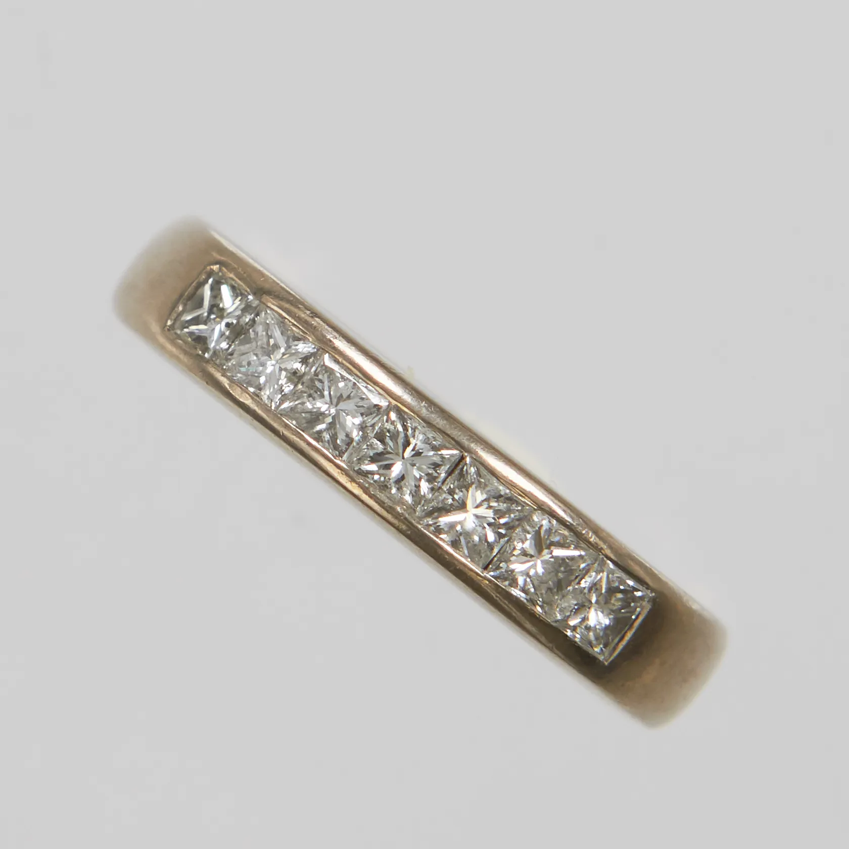 Ring med 7 princesslipade diamanter 0,56ctv enligt gravyr, Ø15¾, bredd: 3,9mm, gravyr, vitguld, 18K Vikt: 7,3 g.