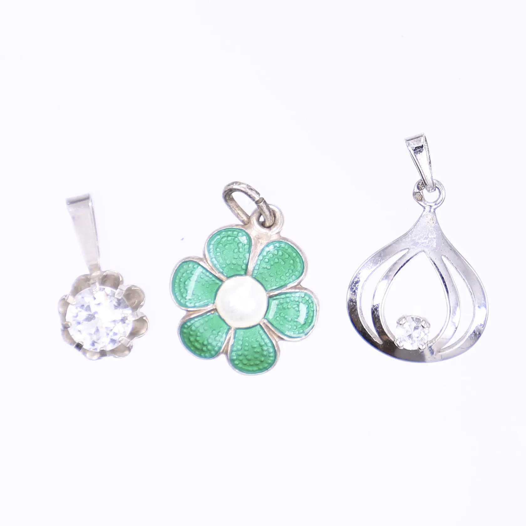 3 Hängen med grön emalj och vita slipade stenar, Ø6-12mm, den gröna är norsk och märkt NM (norskt mönster), silver 925/1000 Vikt: 2,7 g.