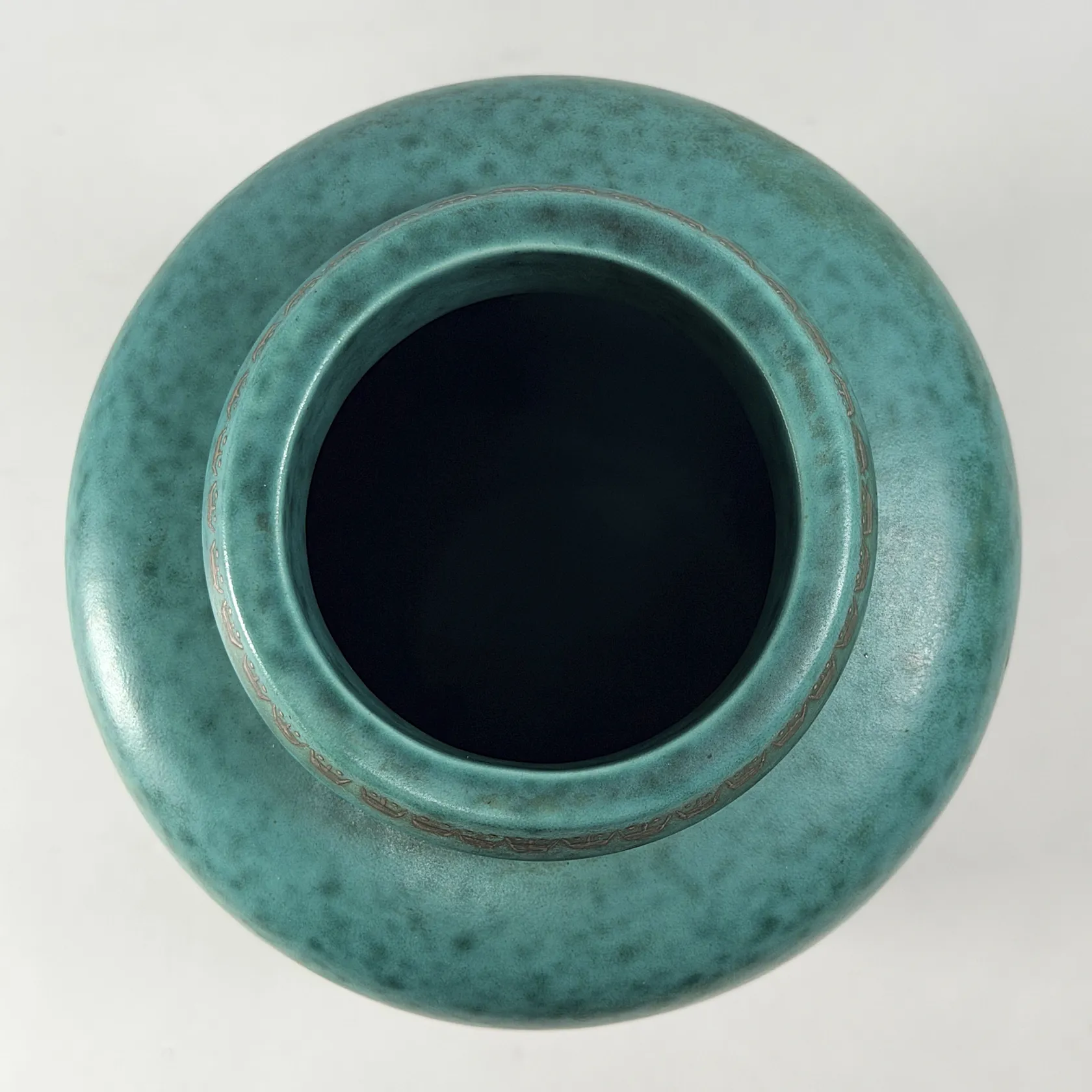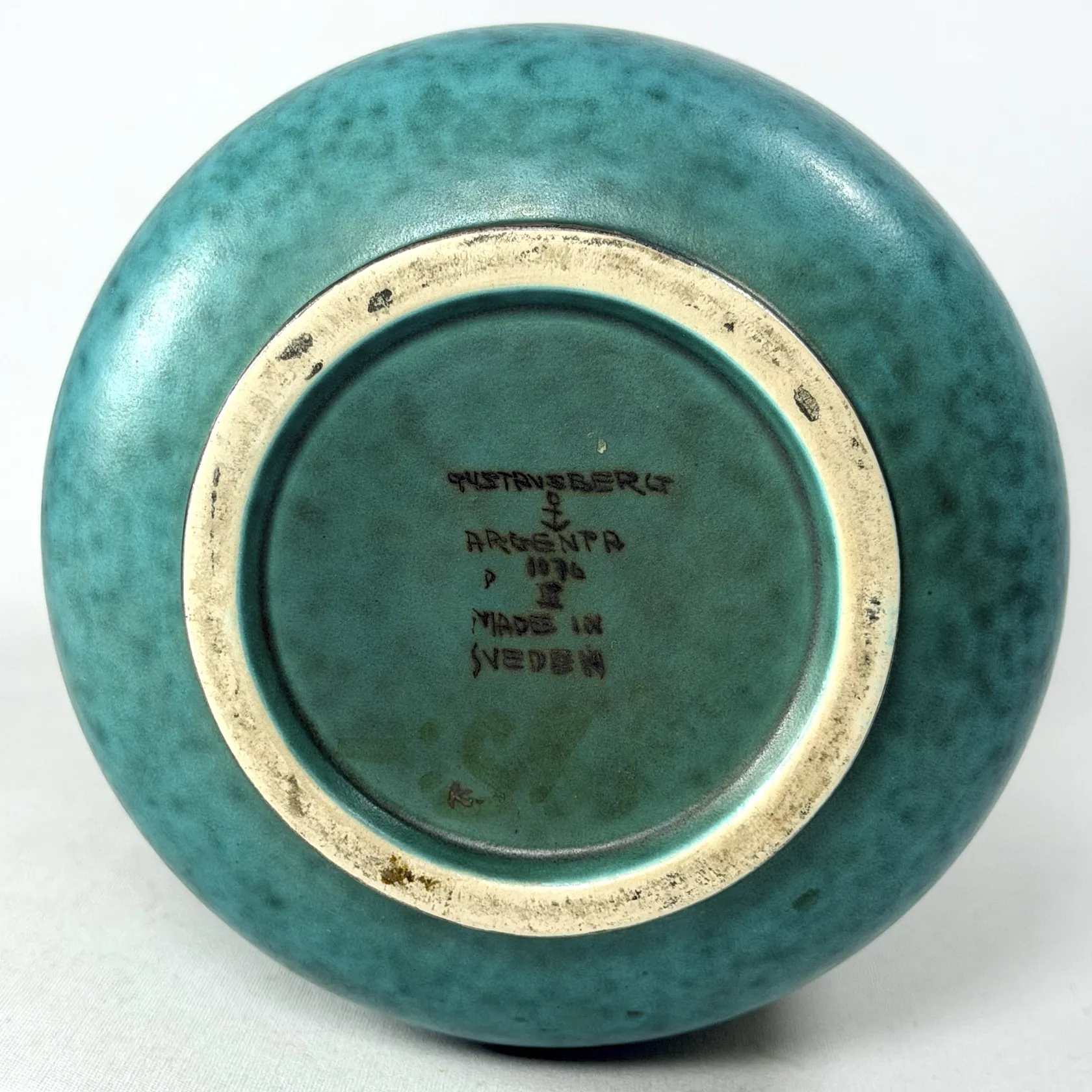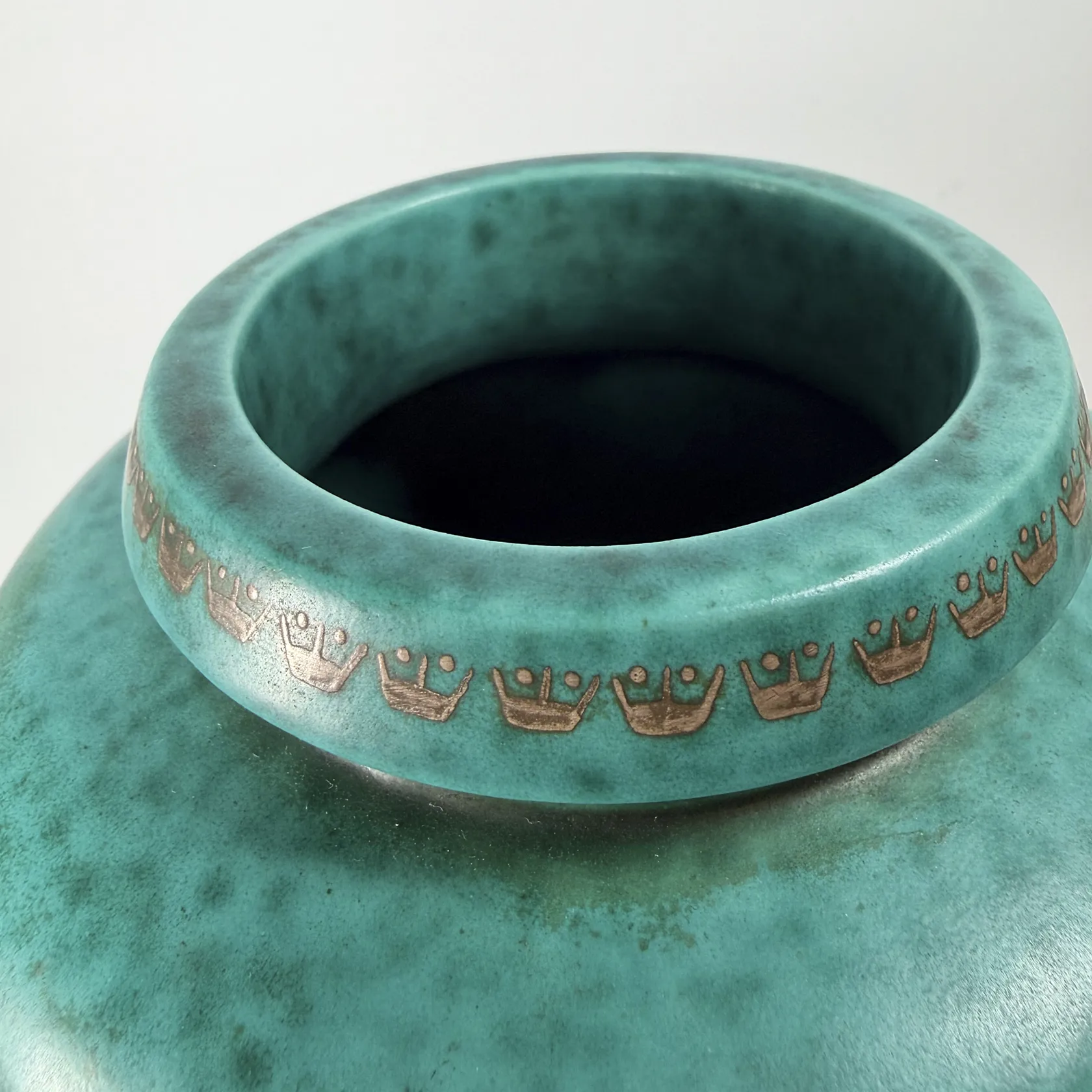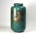 Vas, Wilhelm Kåge, Gustavsberg 1946, "Argenta", stengods, grönspräcklig glasyr med handmålad silverdekor av lejon, signerad GUSTAVSBERG ARGENTA 1076 P III MADE IN SWEDEN, höjd 28cm, några invändiga glasyrmistor Skickas med postpaket.