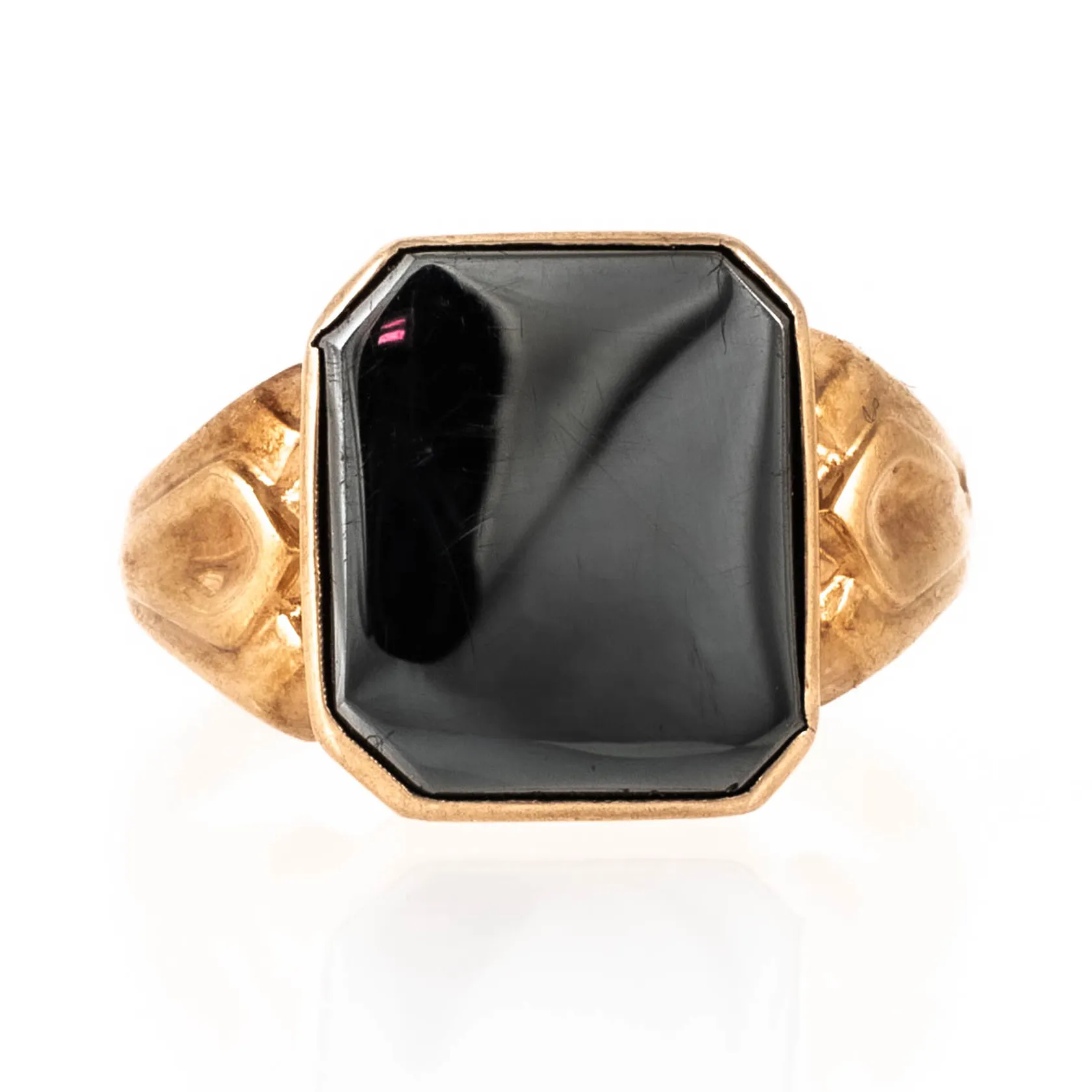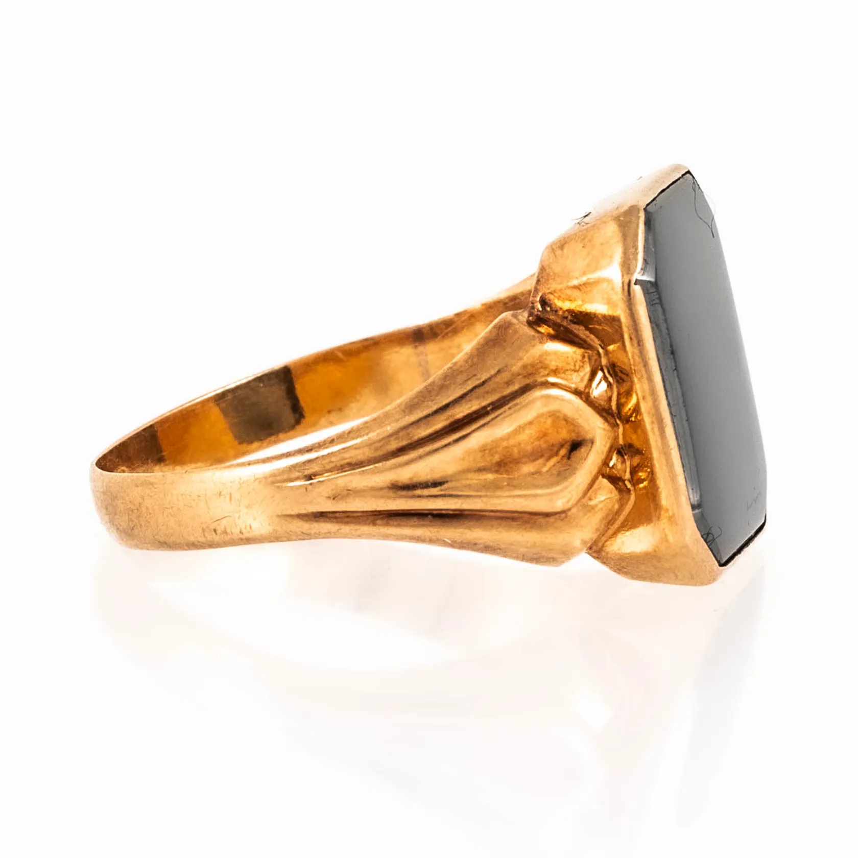 Klackring i 18K guld med hematit. Den är i storlek 19¾, är 2,8 - 14,5 mm bred och väger 5,0g. Stämplad G9 (1957), G&JG (H G Baeckgård Guld & Juveler, Göteborg), 18K & kattfot. Vikt: 5 g.