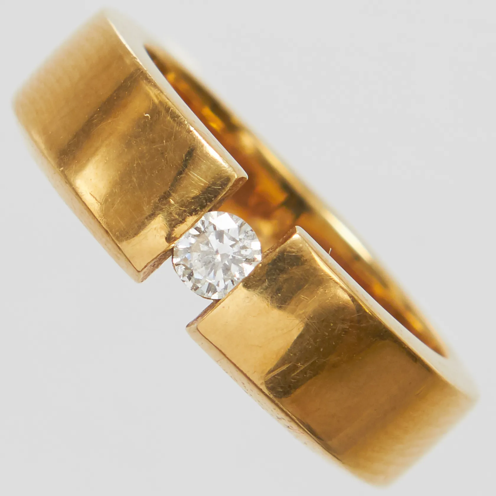 Ring med diamant 1 x ca.0,15ct, Ø17¼, bredd: 6mm, svenska stämplar, ihålig, 18K Vikt: 4,5 g.