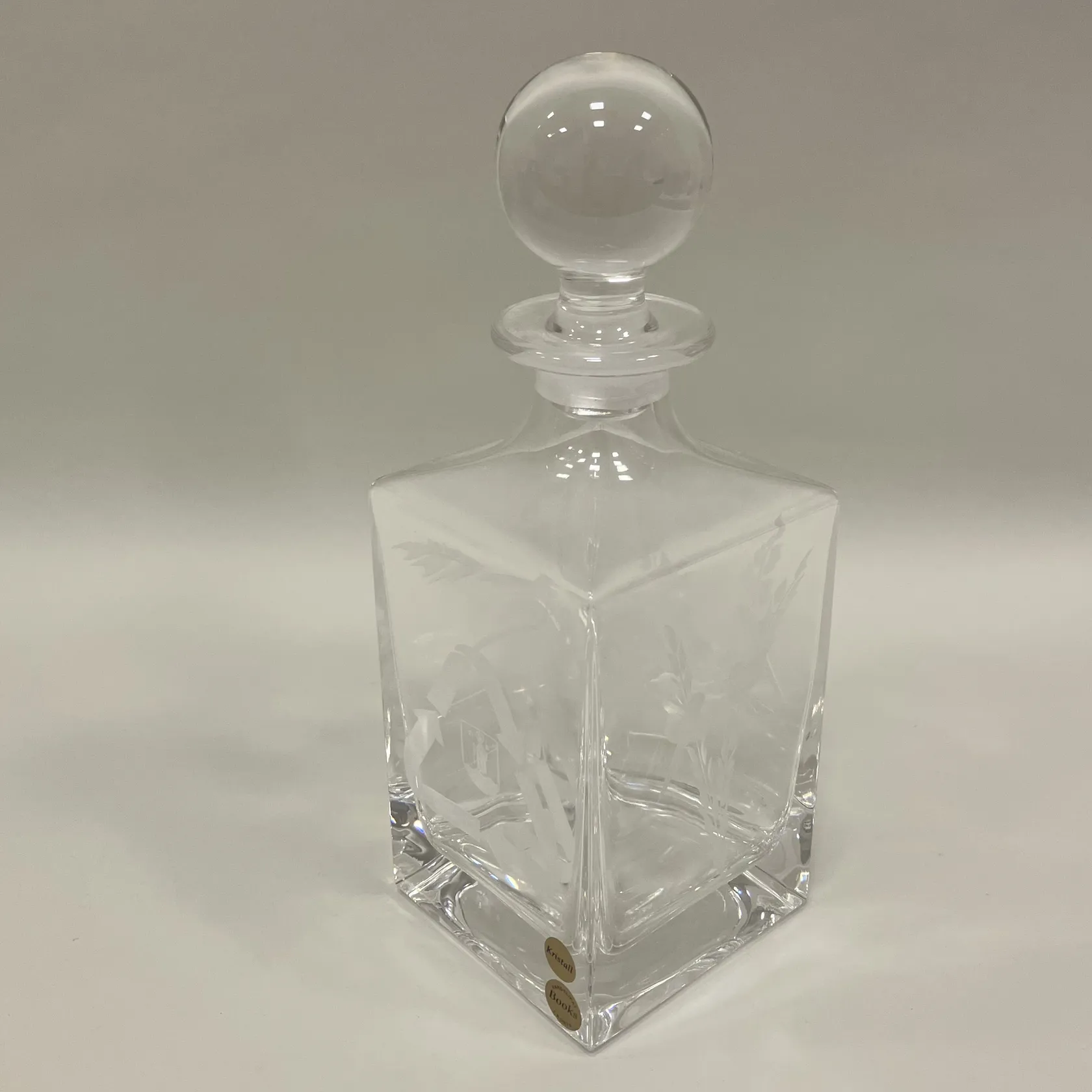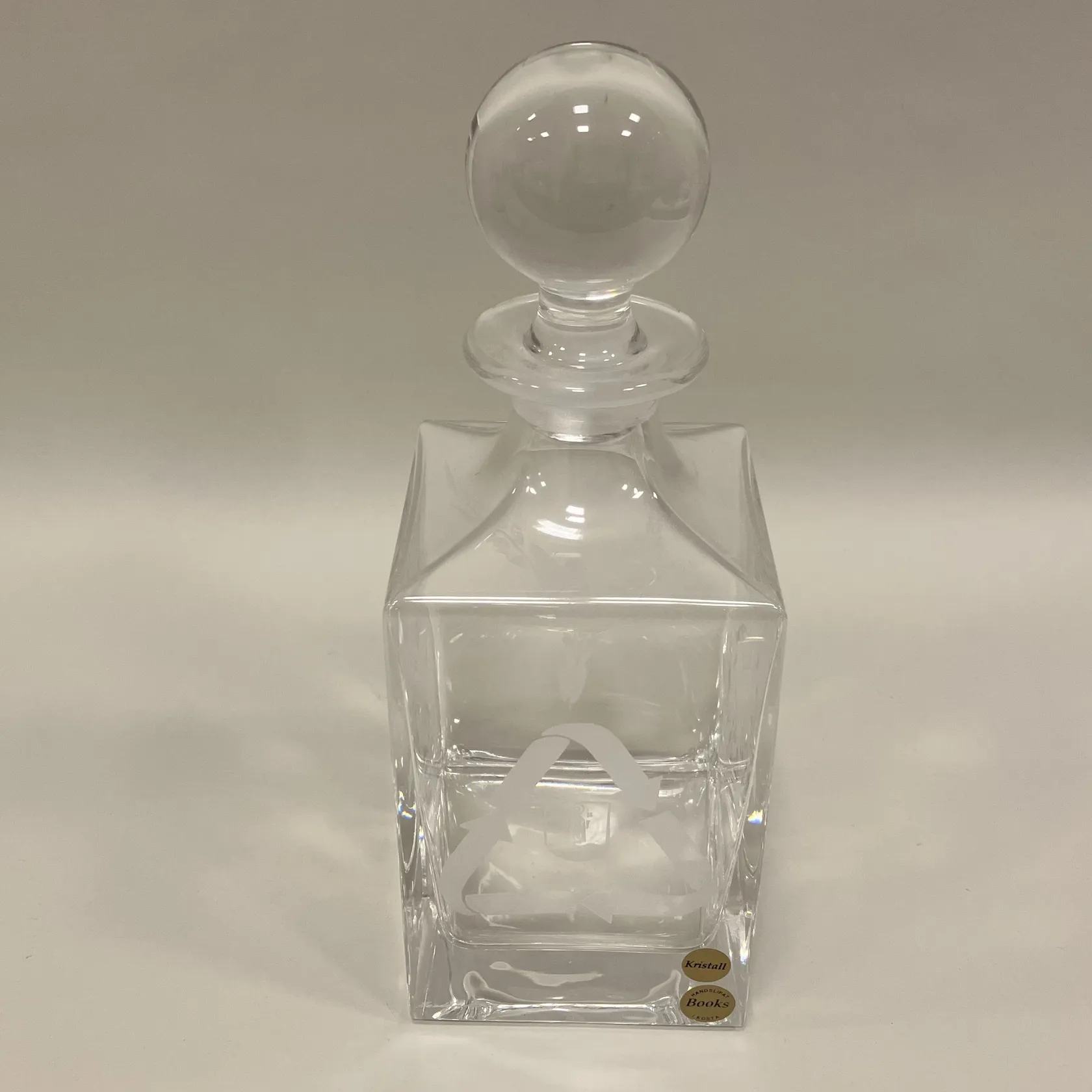 Karaff med propp, Books i kosta boda, höjd 25,5cm, slipad dekor av fåglar, återvinning samt Växjös kommunvapen Skickas med postpaket.