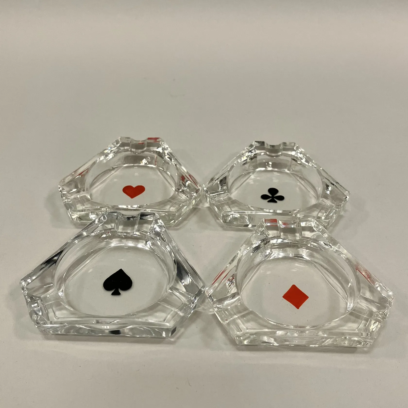 4 små askfat i glas, hjärter, ruter, spader, klöver, höjd 1,5cm, Ø ca 7cm Skickas med paket..