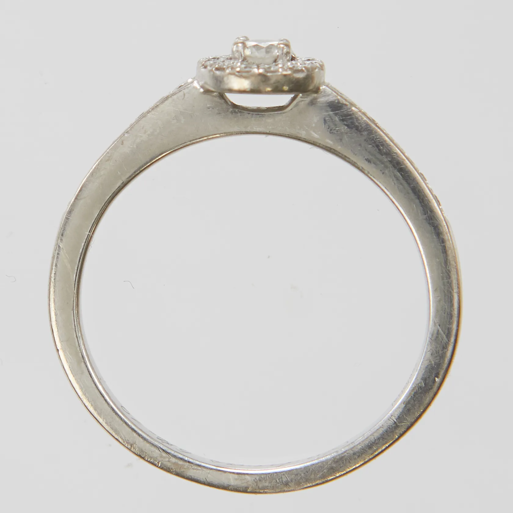 Ring med diamanter 1xca0,14ct+14xca0,01ct samt 14xca0,005ct, Wesselton/SI, Ø17¾, bredd:1,5-6mm, vitguld, Guldfynd, personlig gravyr, 18K Vikt: 4 g.