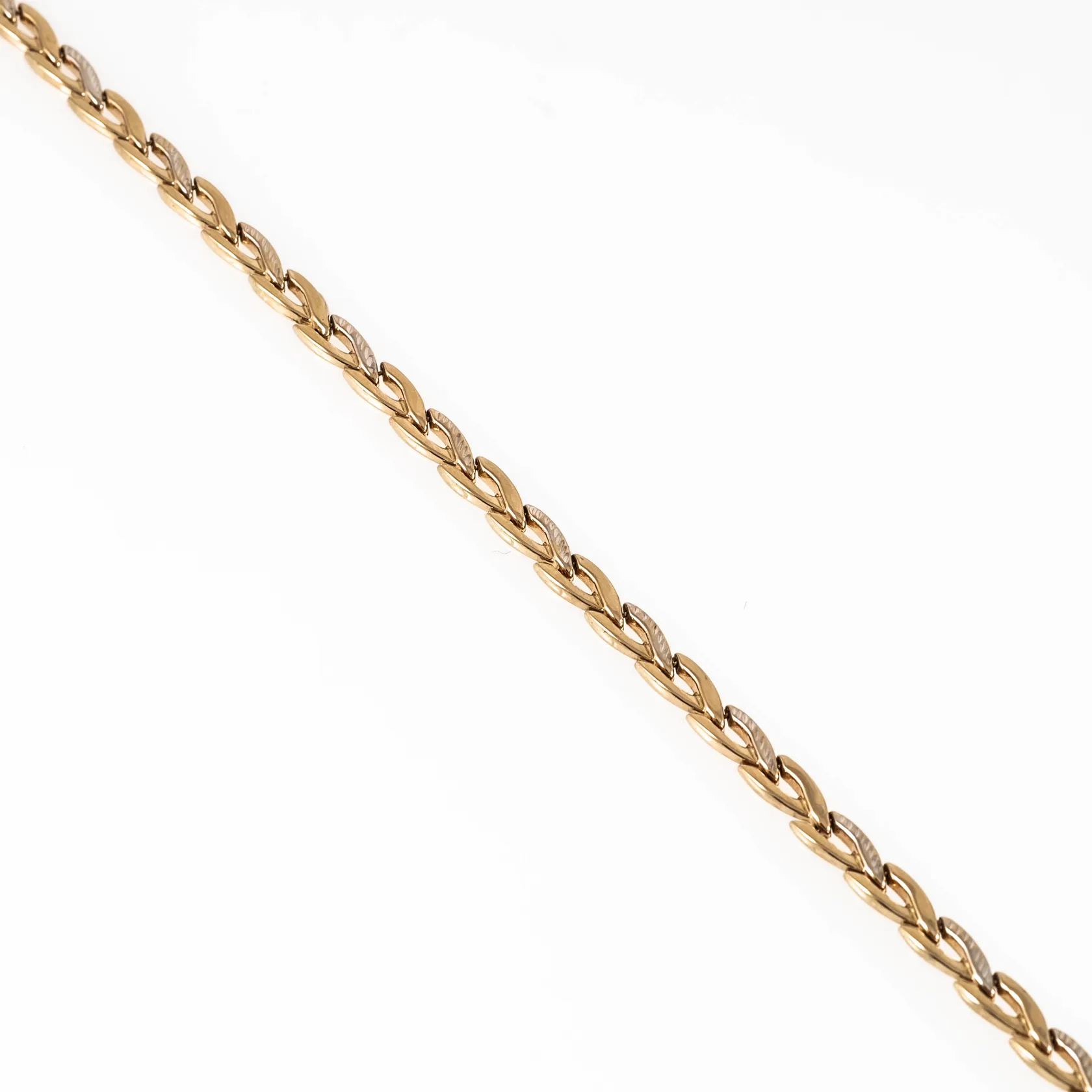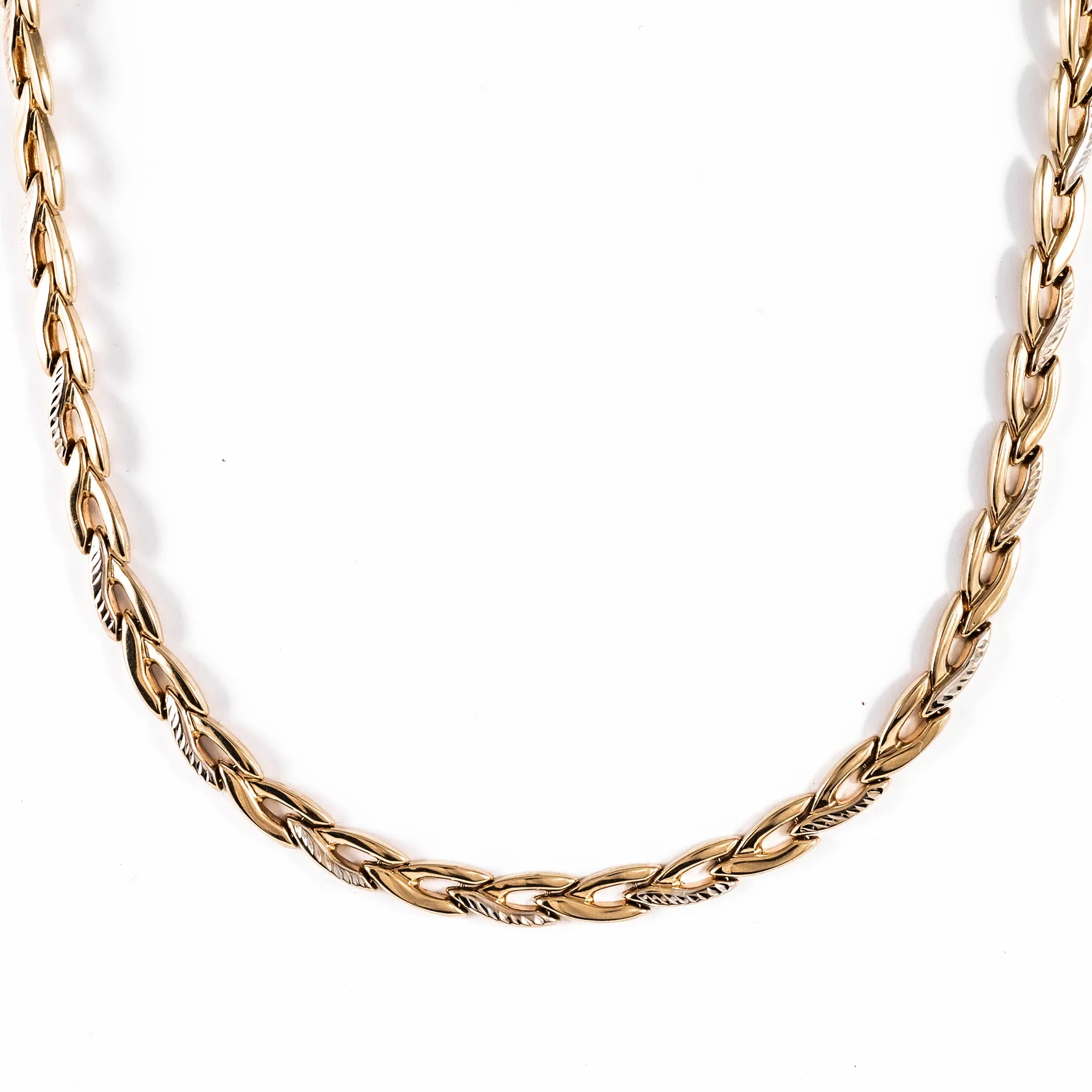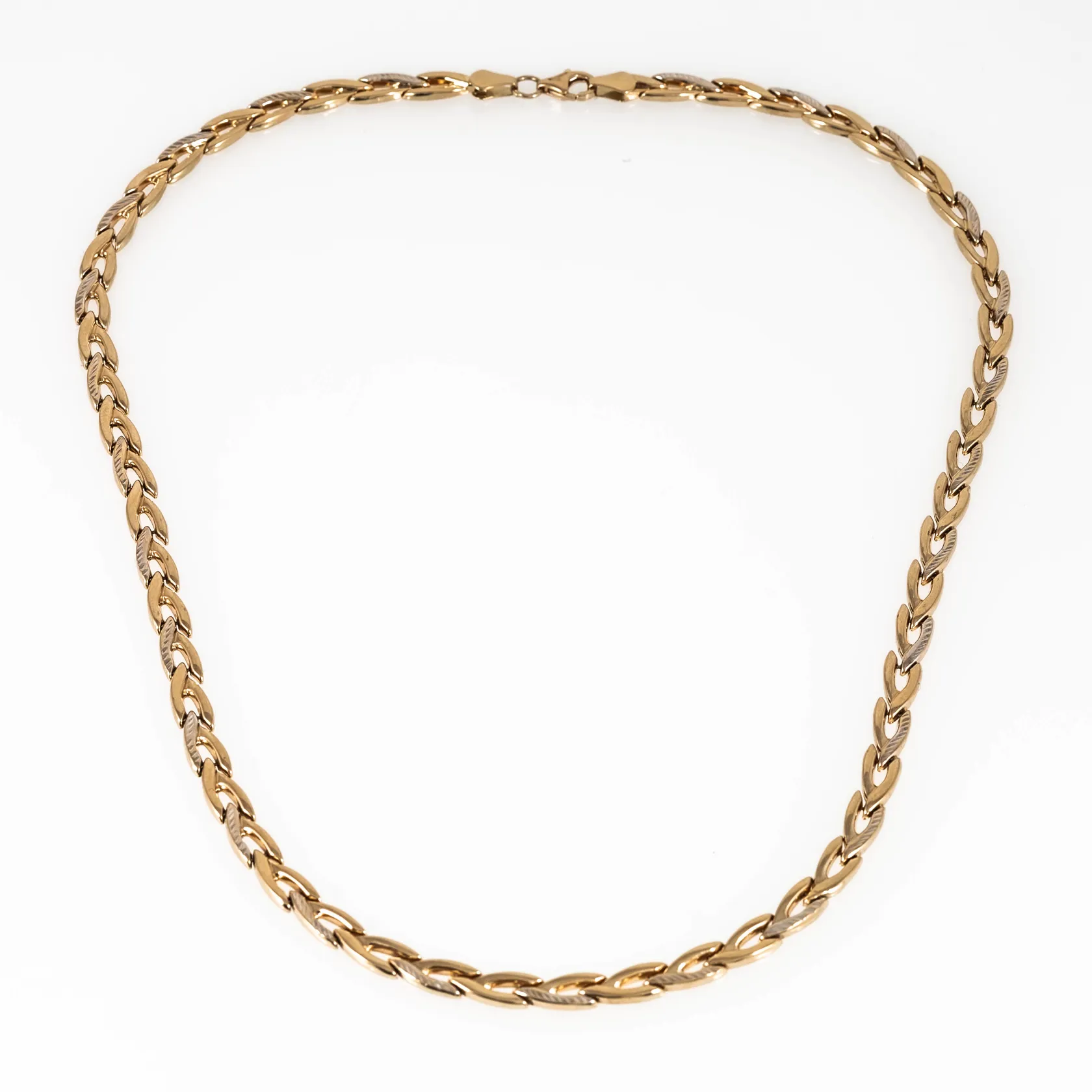 Collier i 14K med fasettdetaljer. Det är 46 cm långt, 5 mm brett och väger 10,9g. Karbinhake. Fint skick. Vikt: 10,9 g.