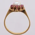 Ring med odlad pärla Ø6,4mm samt röda stenar, stl 18½, bredd 1,2-12,5mm, 18K Vikt: 4,5 g.
