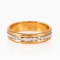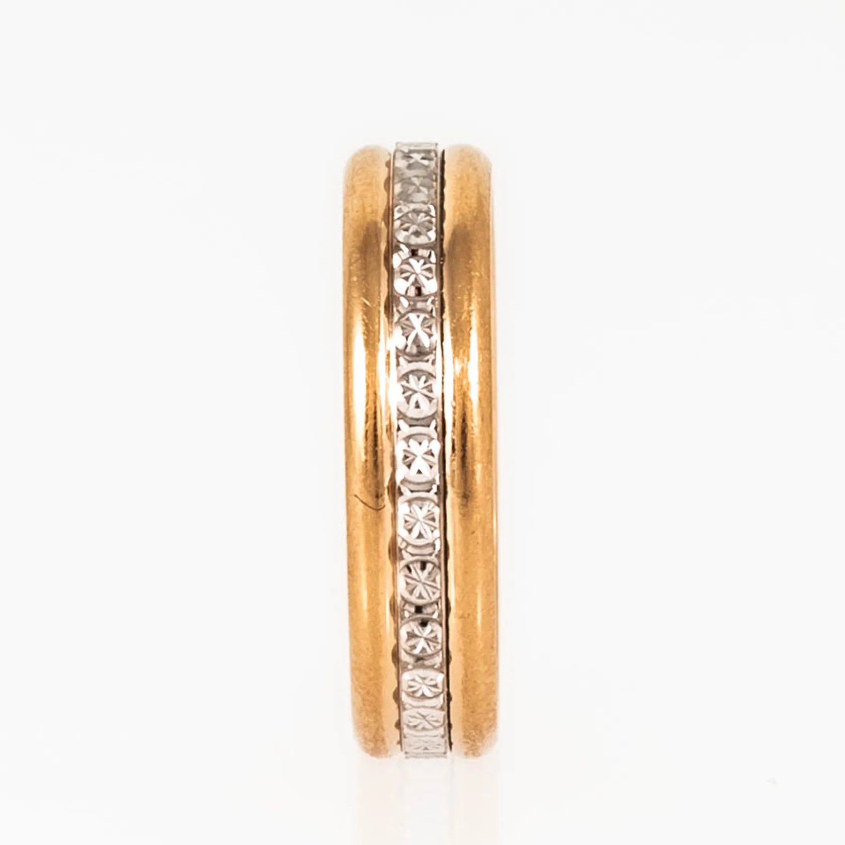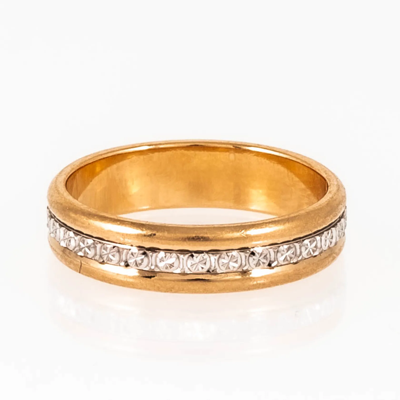Mönstrad ring i 18K guld med facettslipad vitguldsdekor. Den är i storlek 16½, är 4,5 mm bred, 1,4 mm hög och väger 4,4g. Stämplad FU (Flemming Uziel AB, Helsingborg), 18K. Fint skick. Vikt: 4,4 g.
