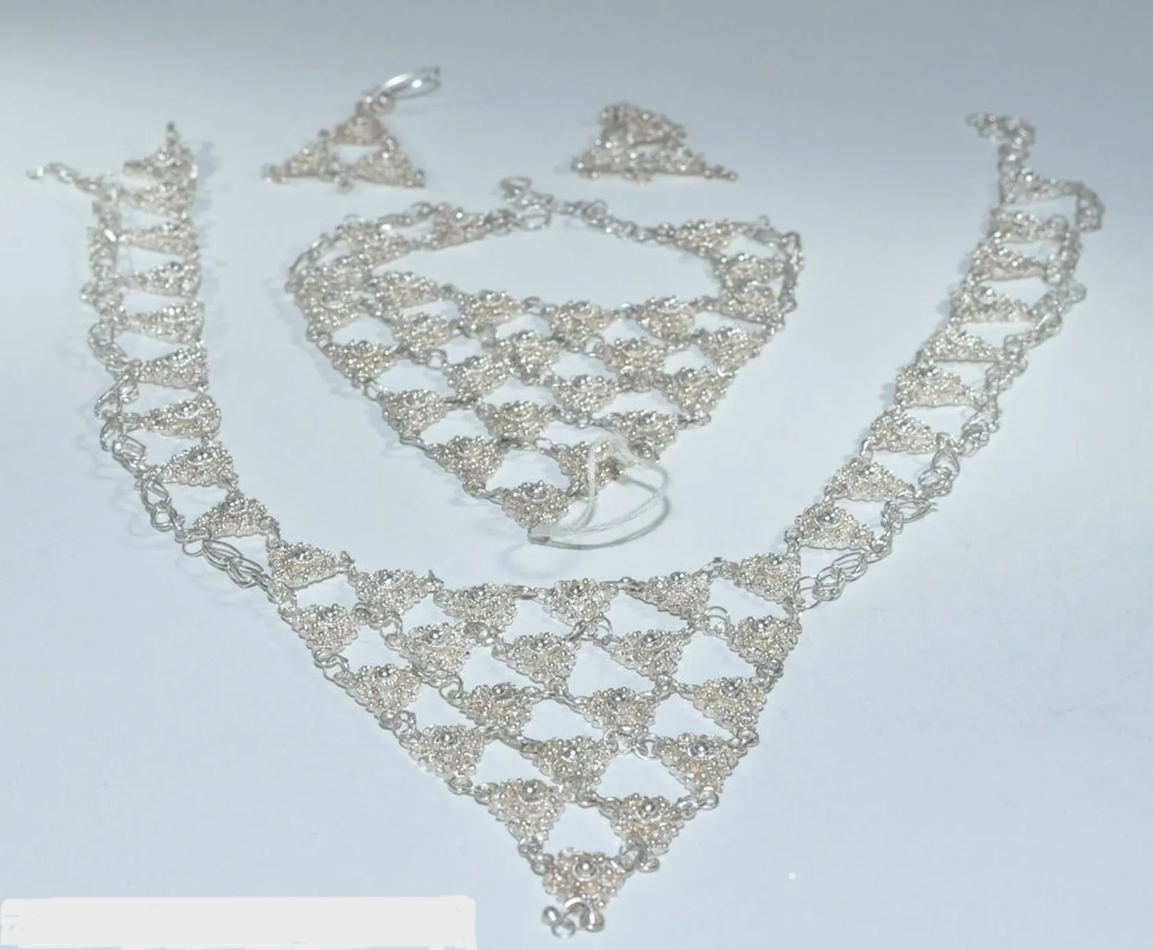 Par örhängen L 4,5 cm +1handsmycket r ingen saknas + collier 1 bit vid låset behöver lödas Vikt: 56,7 g.