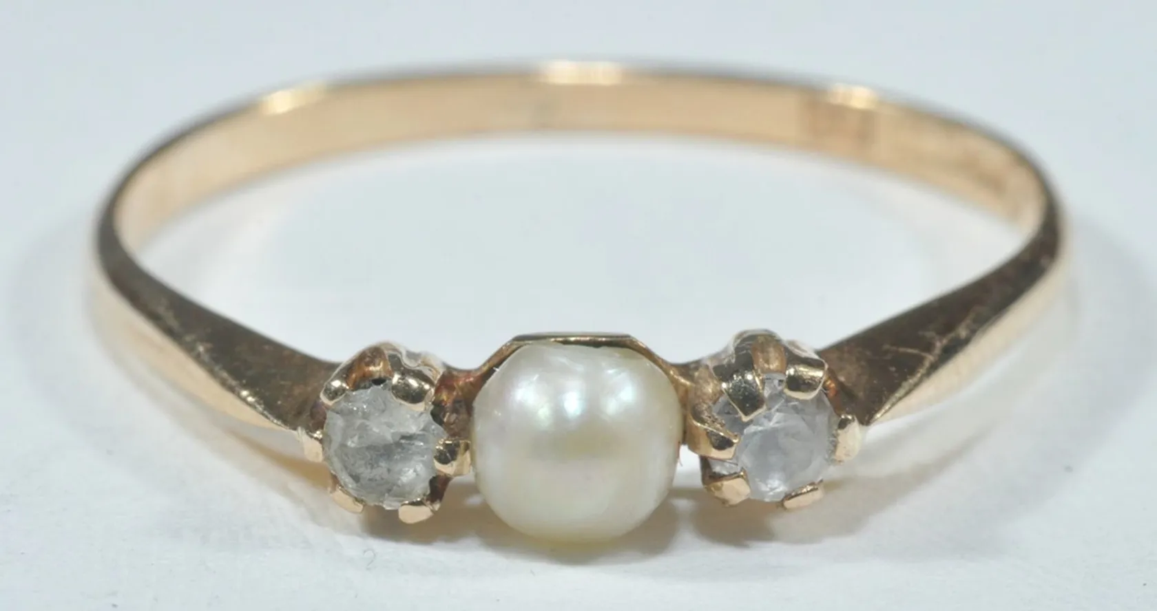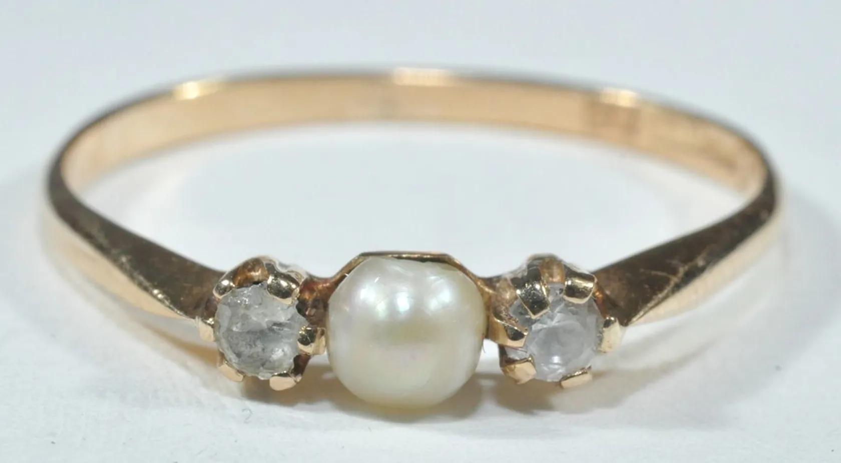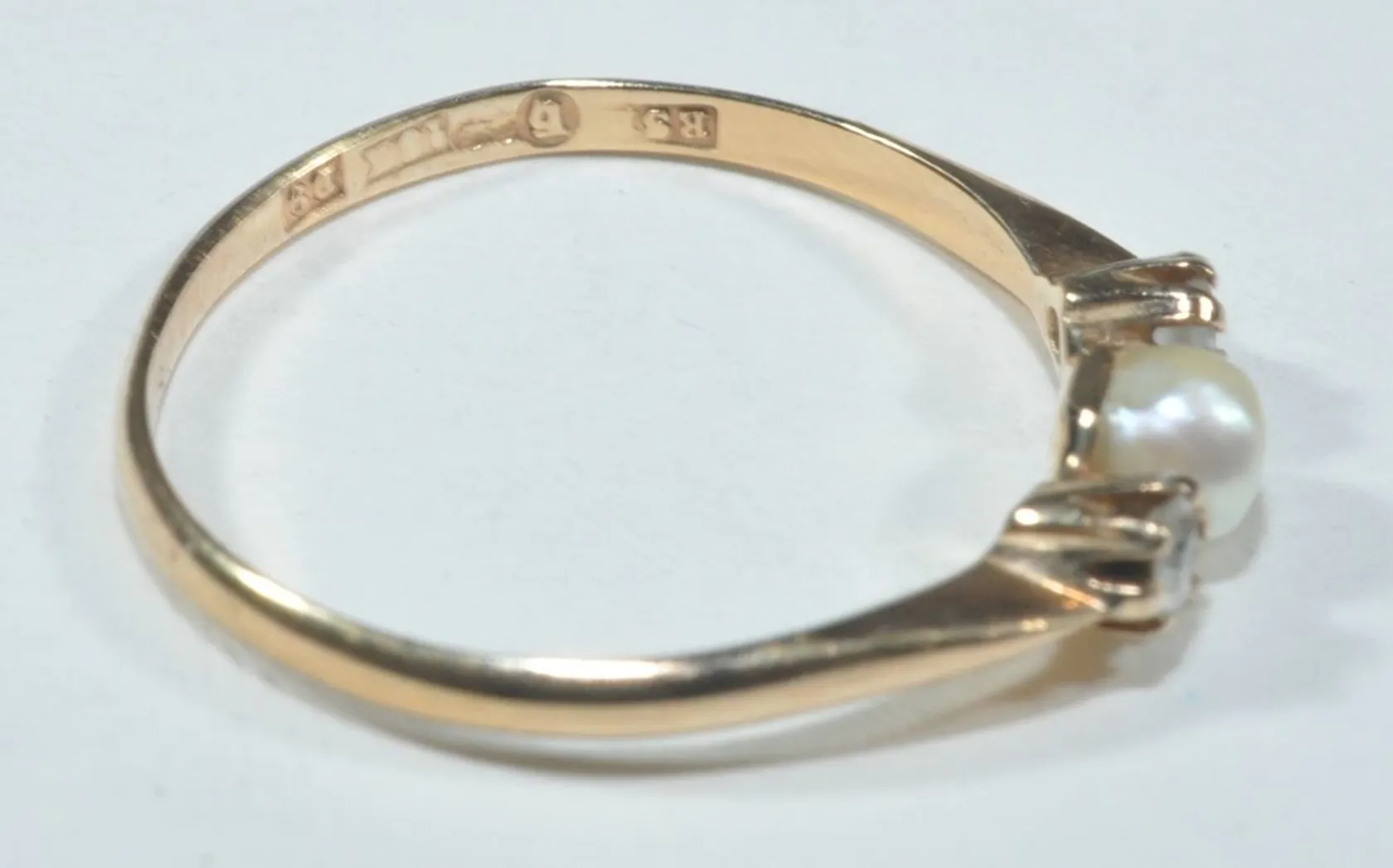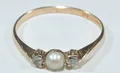Ring med pärla och stenar, Ø 18 mm, Bredd 1,5 - 3 mm 18k. Lite ojämn skena, knappt märkbart. Vikt: 1,6 g.