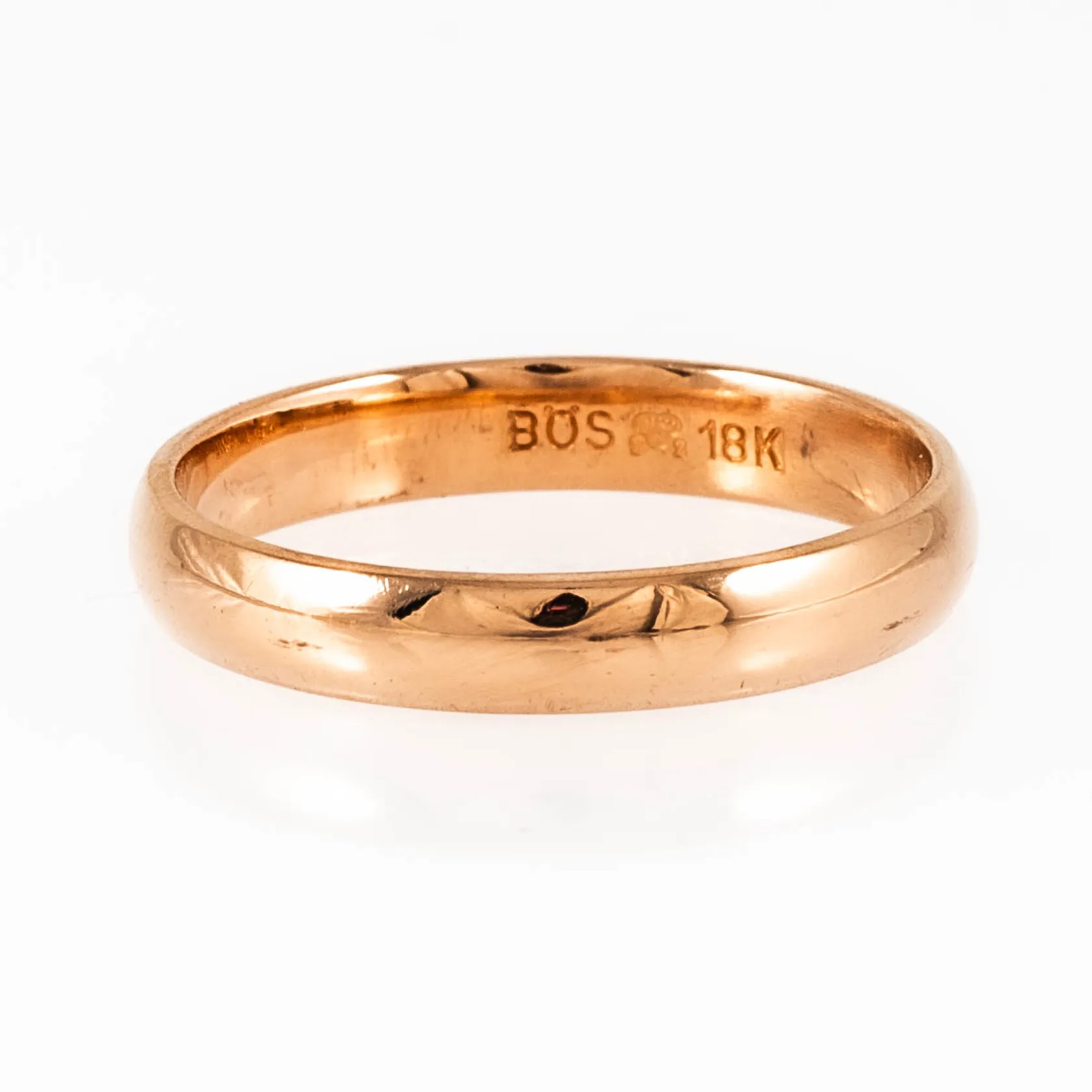 Slät ring i 18K guld. Den är i storlek 17½, är 3,5 mm bred, 1,3 mm hög och väger 3,2g. Kupad insida. Stämplad BÖS (Schalins Ringar, Östersund), 18K & kattfot. Ingen personlig gravyr. Fint skick- spegelblank. Vikt: 3,2 g.