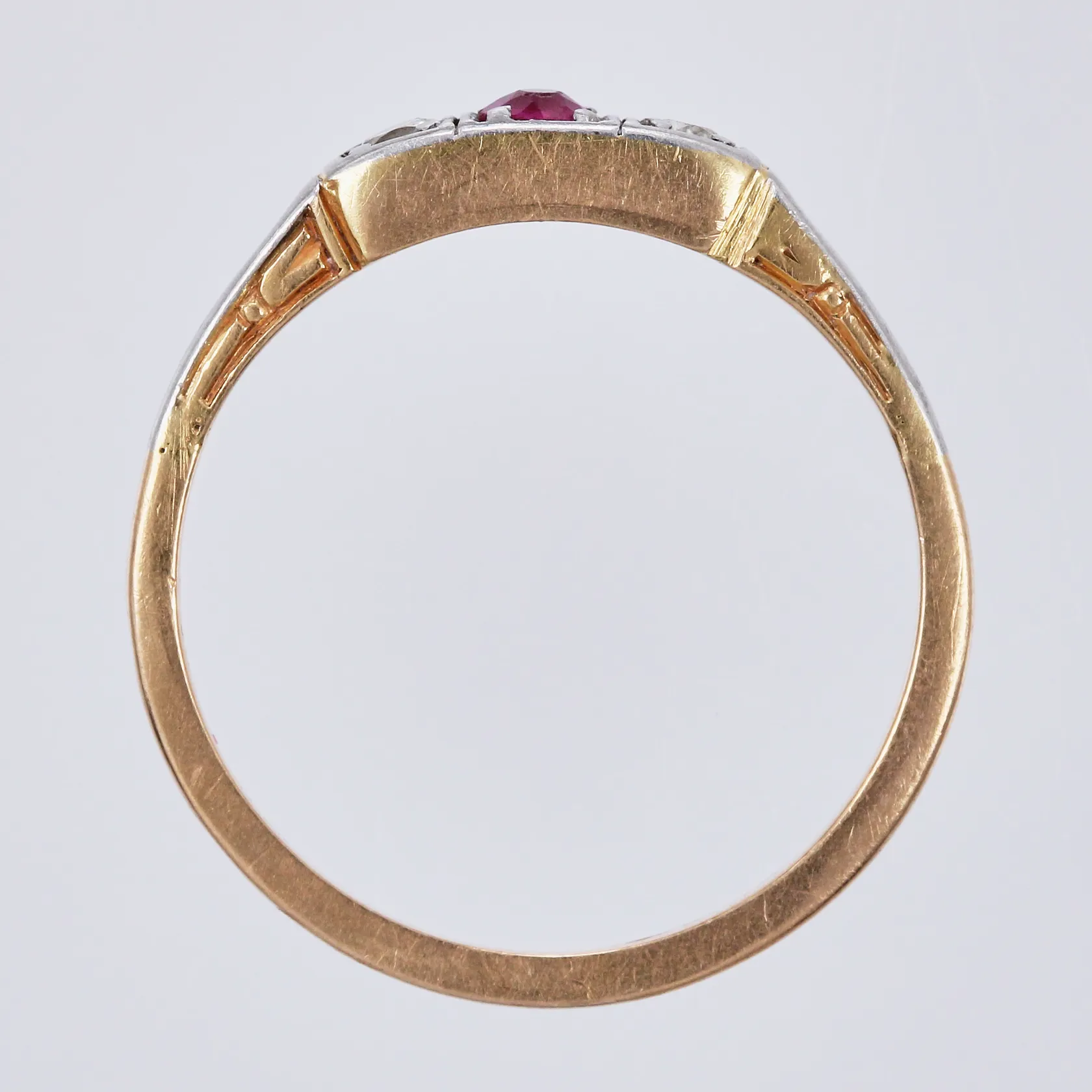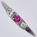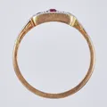 Ring vitguld/gult guld, med röd sten och diamanter ca 2x0,03ct, stl: 17½, bredd: ca 1-3mm, 18K Vikt: 2 g.