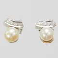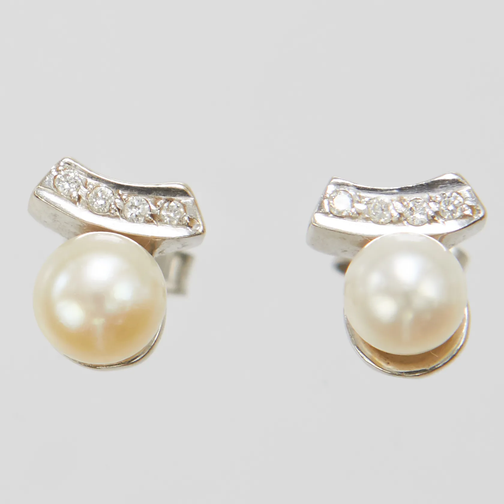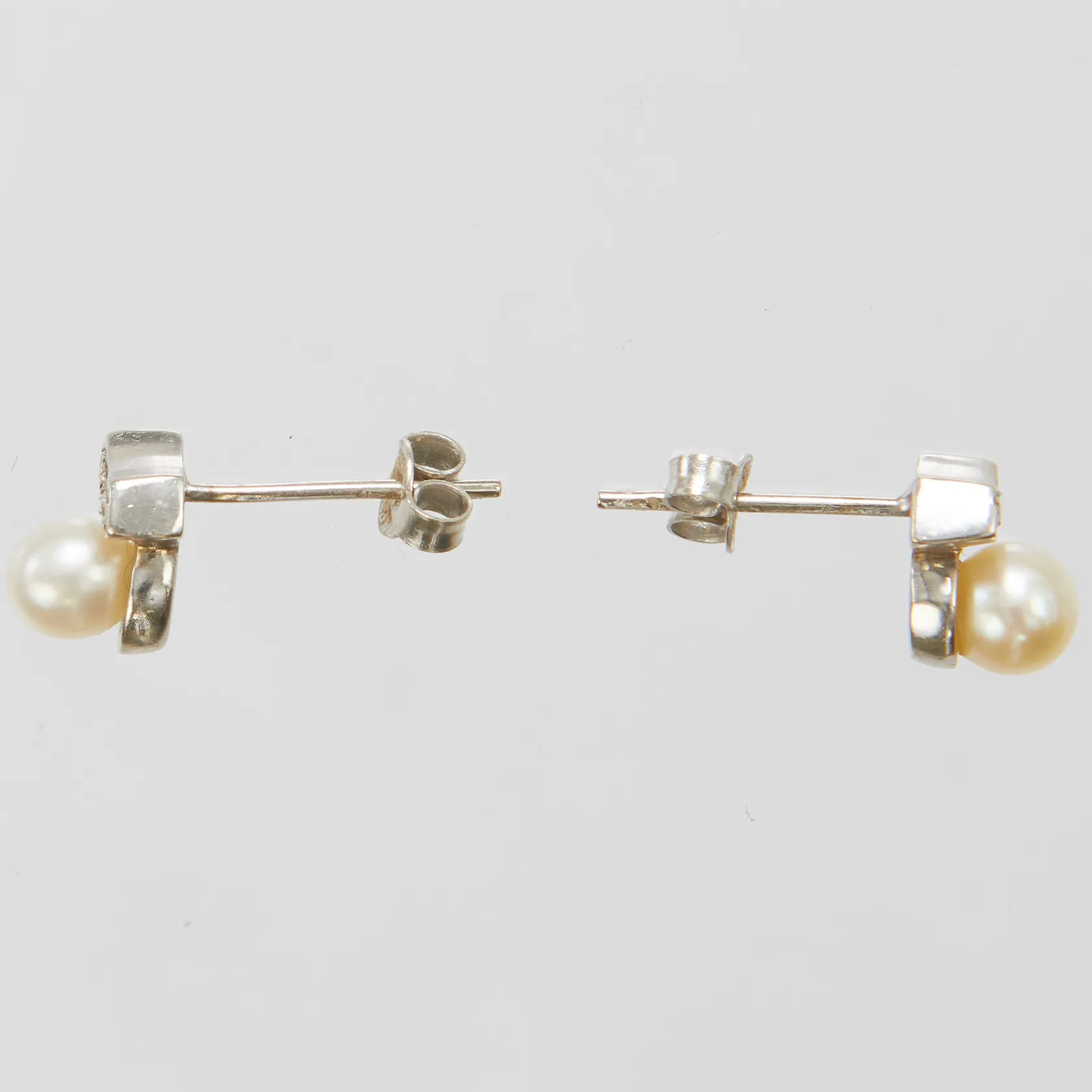 Ett par örhängen, odlade sötvattenpärlor samt briljantslipade diamanter 8 x ca 0,005ct, vitguld, skevt stift, 18K Vikt: 4,3 g.