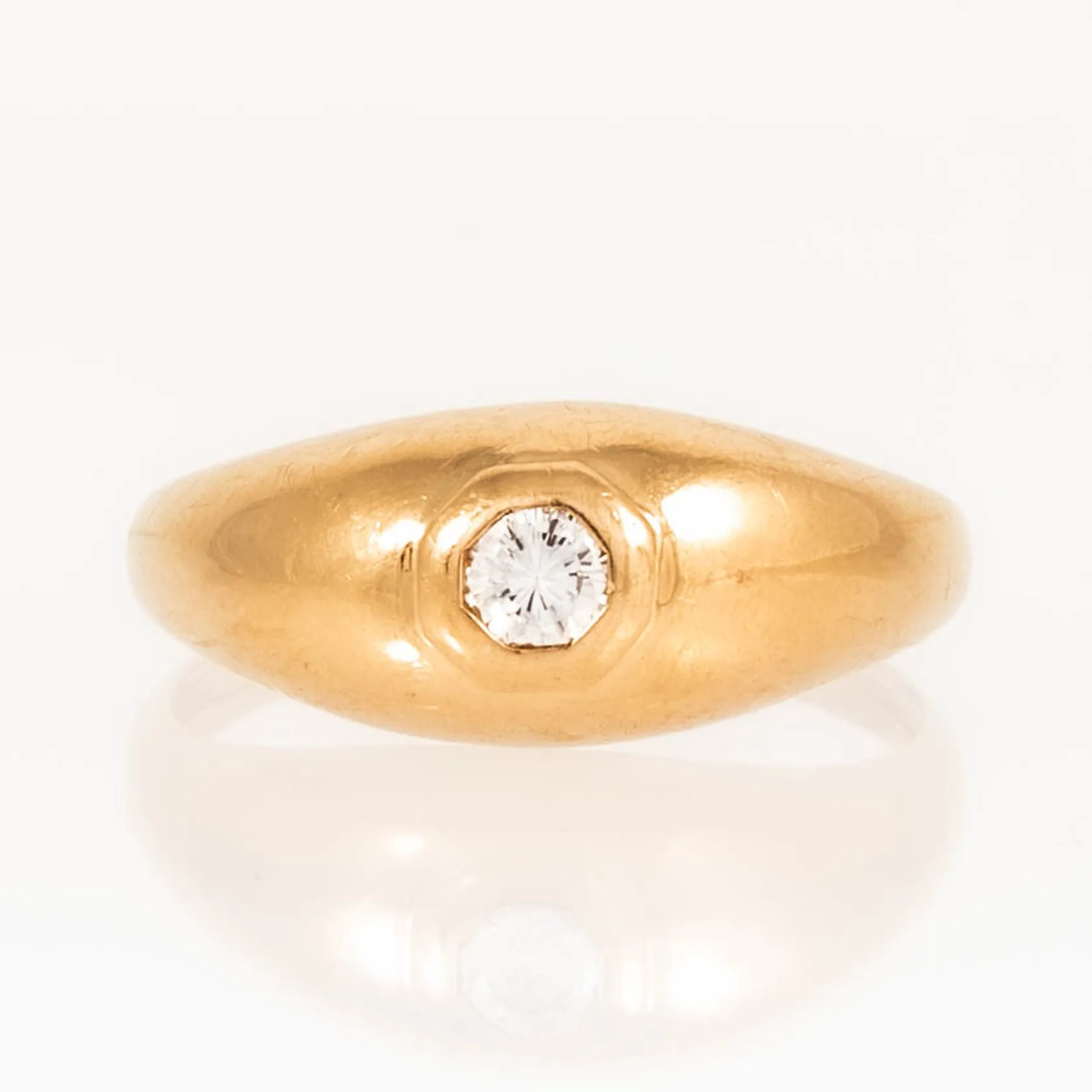 Kupad doserad ring i 18K guld med en vit sten. Den är i storlek 17¼, är 2 - 7,8 mm bred och väger 2,5g. Stämplad GFAB, 750. Vikt: 2,5 g.