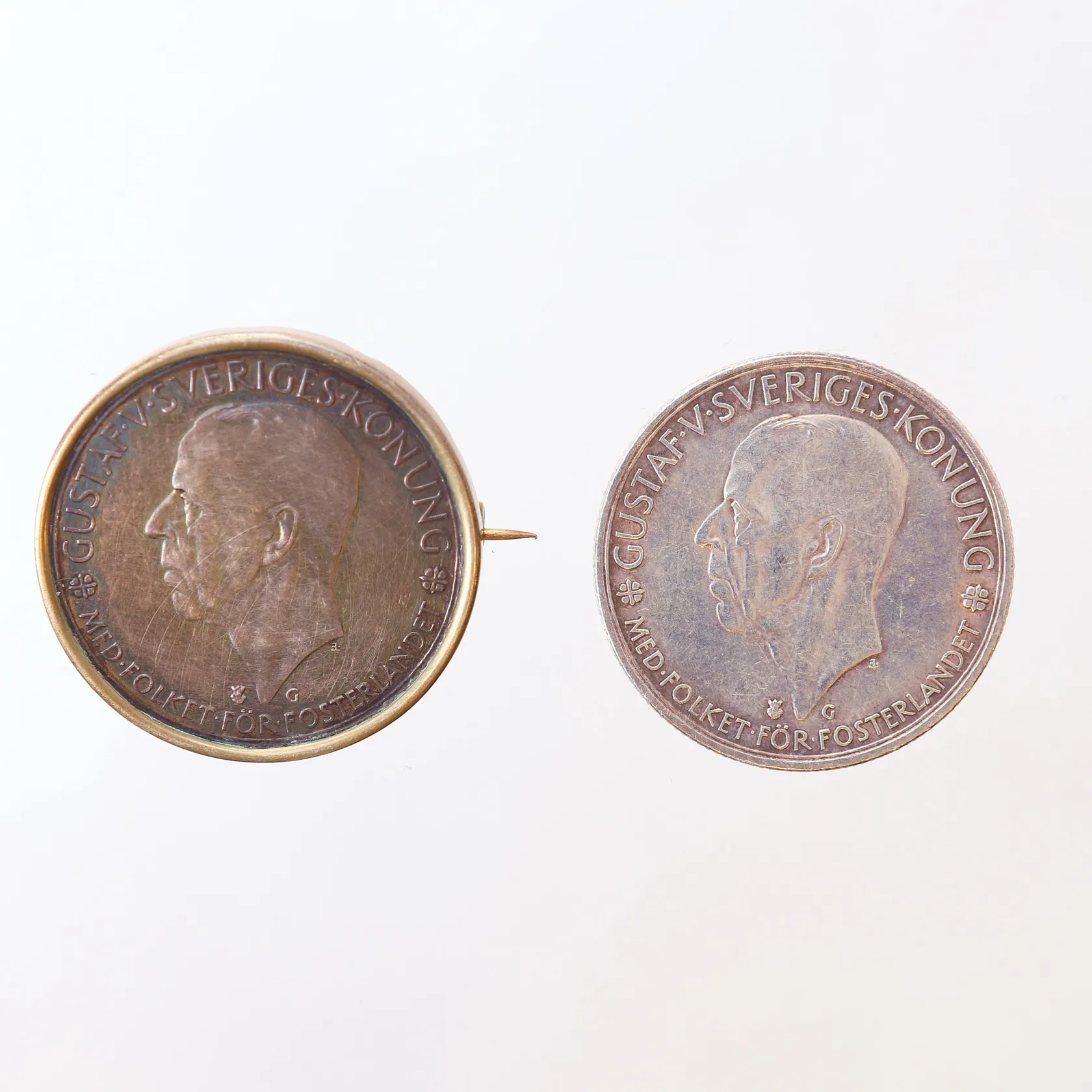 2 Mynt/brosch, Gustaf V Sveriges Konung, 1935-1435, Ø36mm, 5kr, 900/1000 silver Vikt: 53,6 g.