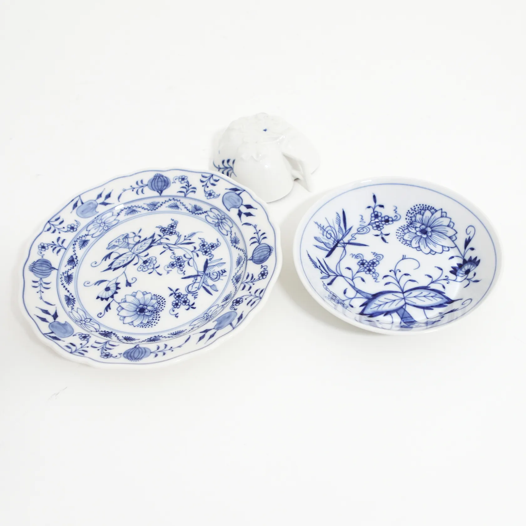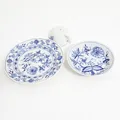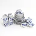 Kaffeservis Meissen, Lökmönstret, 30 delar bestående av 9st koppar höjd: 6,5cm med fat Ø13,5cm, 9st assieter Ø18cm, 1st sockerskål med lock, 1st skål lövformad, 1st saltkar Skickas med postpaket.