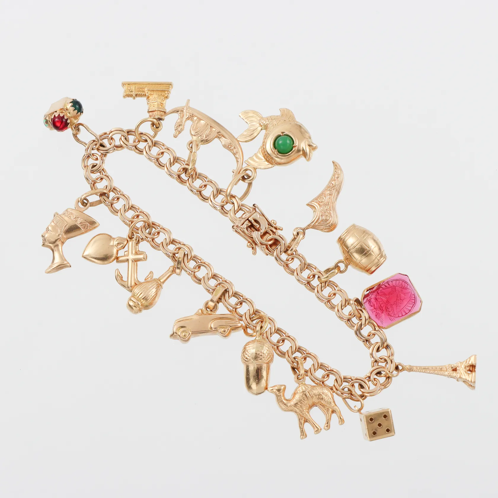 Berlockarmband bismarck med 15 st berlocker, längd ca 18 cm, bredd 5.2 mm,18k. Vikt: 27,8 g.