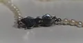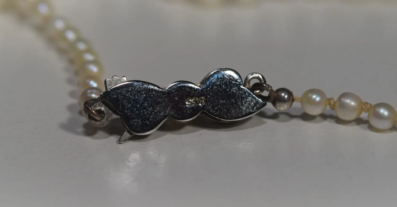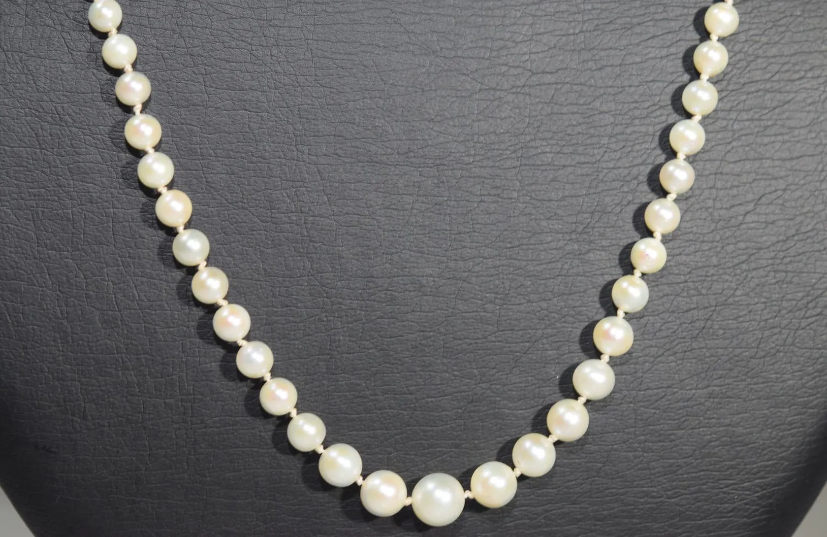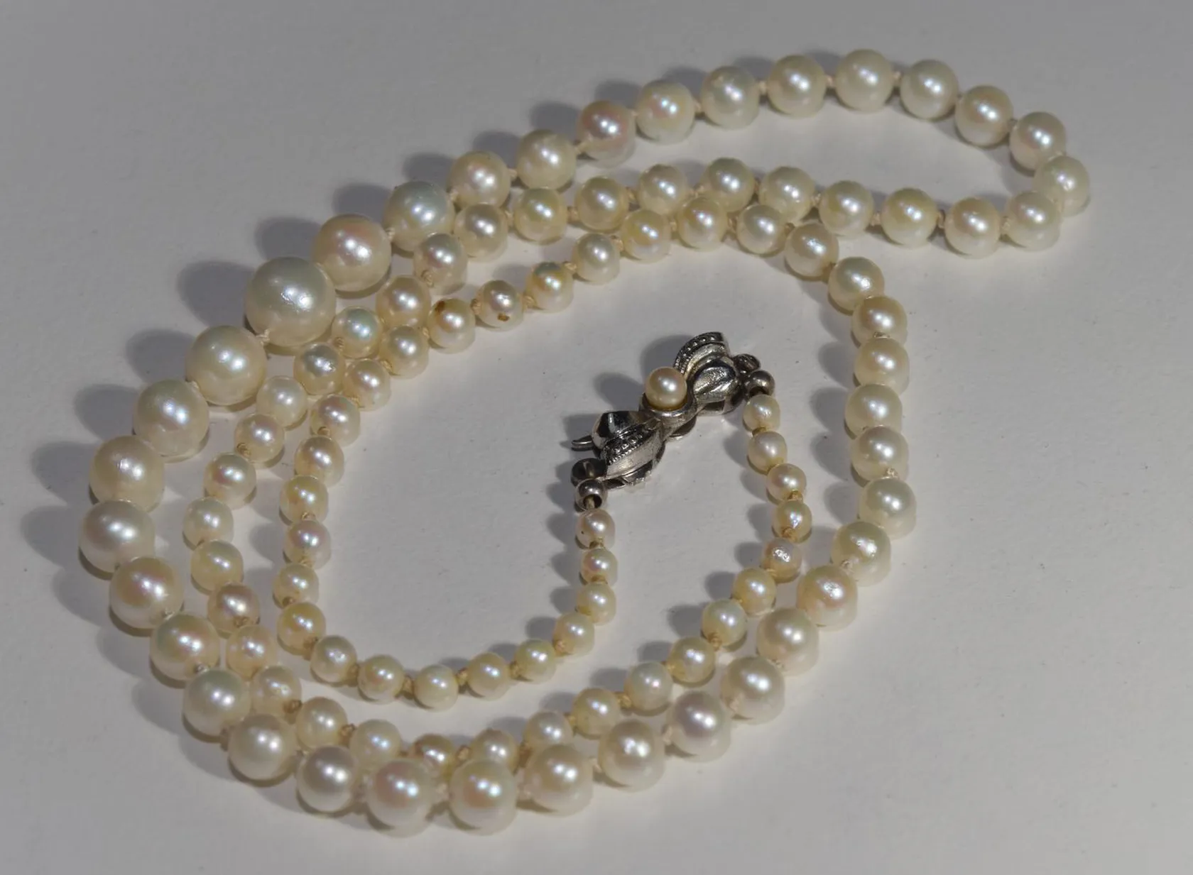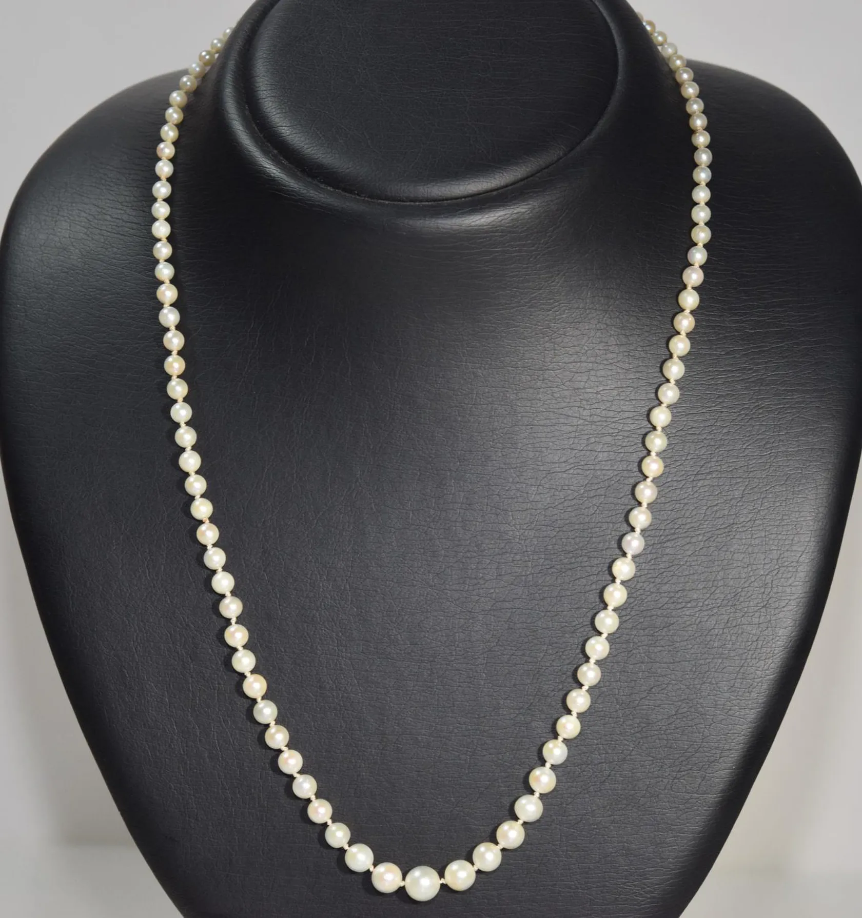 Pärlhalsband sötvattenspärlor, längd 54 cm, bredd 2,95-7,41 mm. Vikt: 14,3 g.