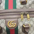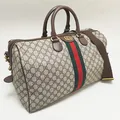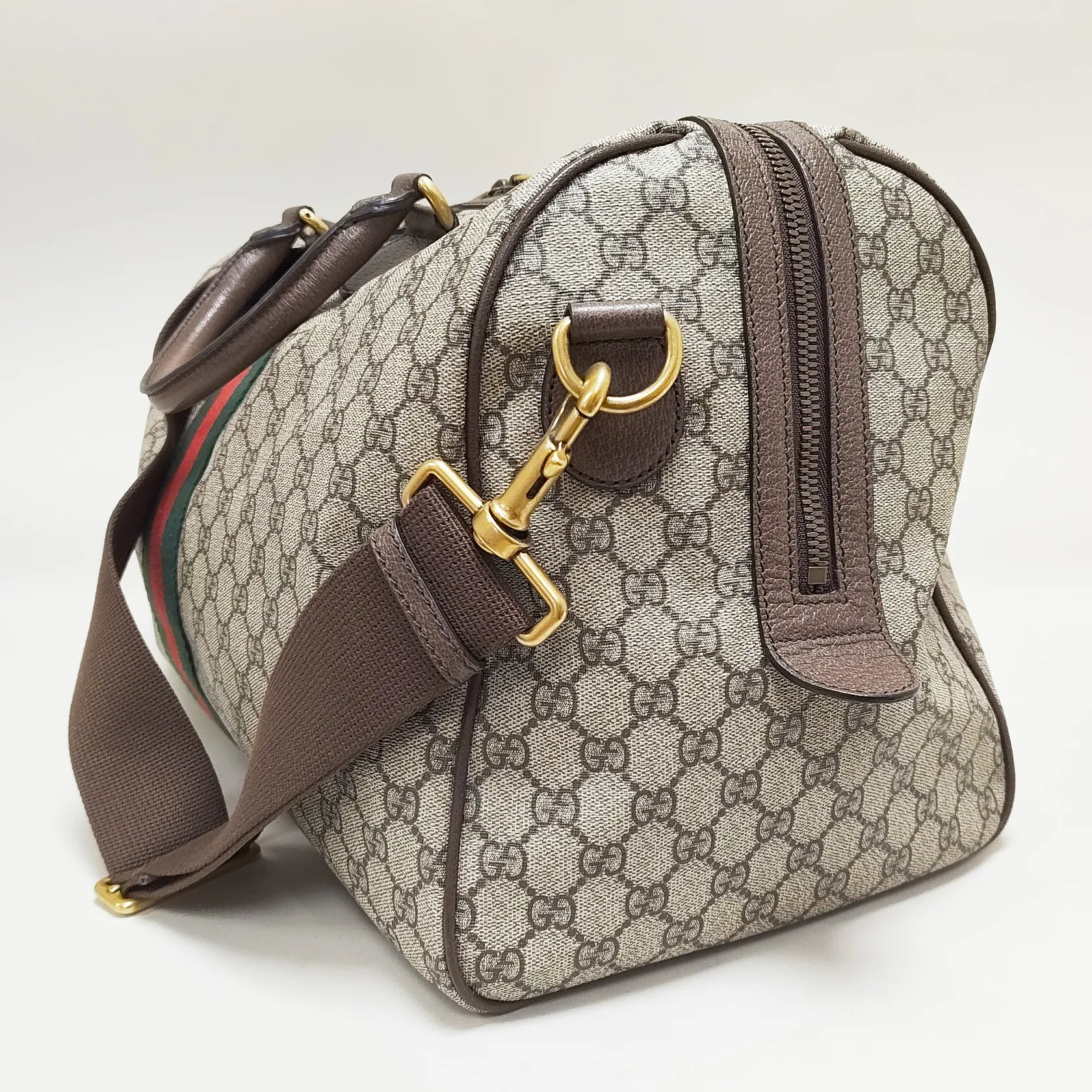 Väska Gucci Savoy medium duffle bag, GG Supreme canvas, brunt läder, refnr: 547953-525040, beslag i gulmetall, avtagbar axelrem, innerficka med dragkedja, två mindre fack, hänglås samt nycklar, adresstag, invändiga fläckar, mindre färgbortfall på beslag, inga tillbehör.
