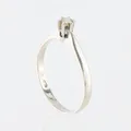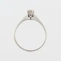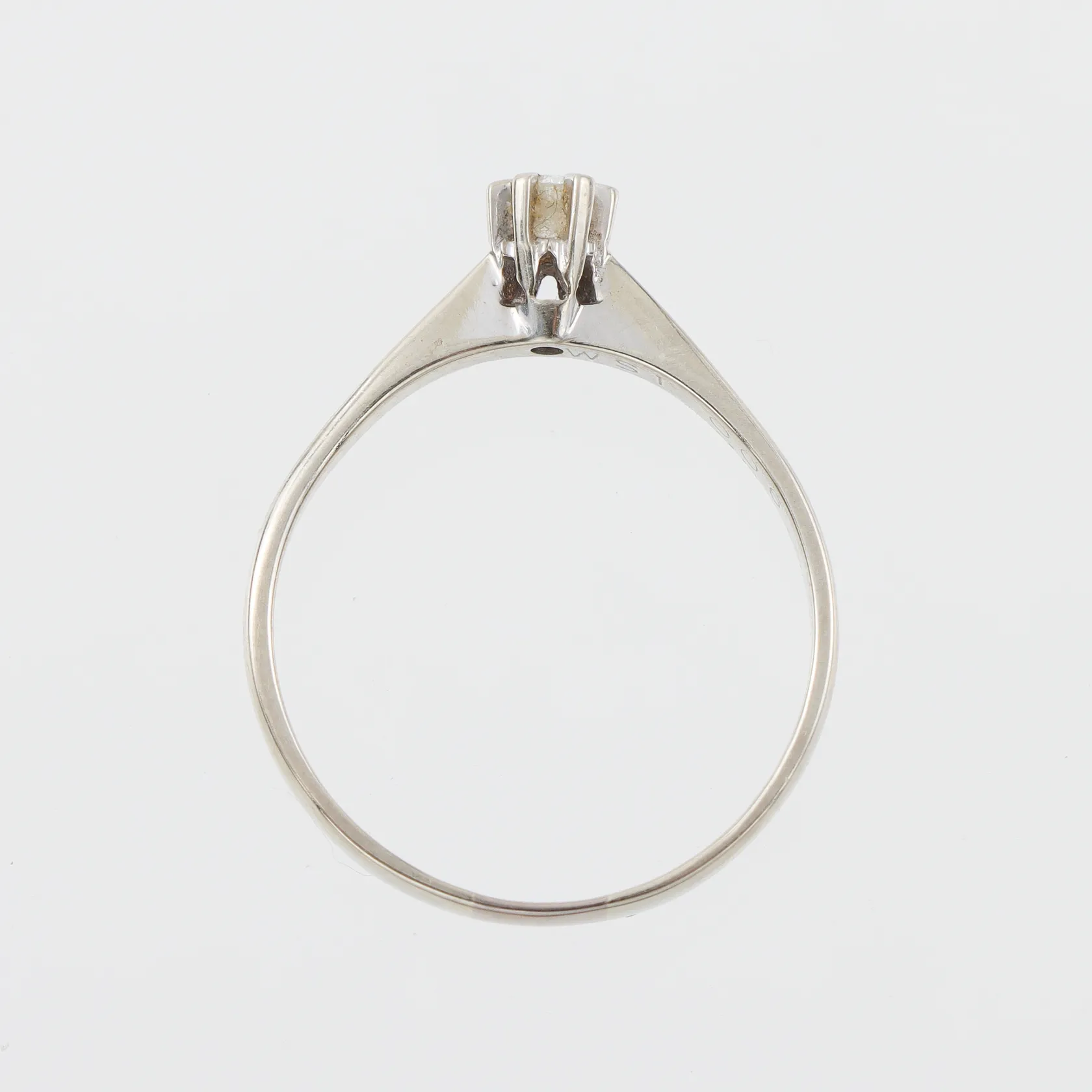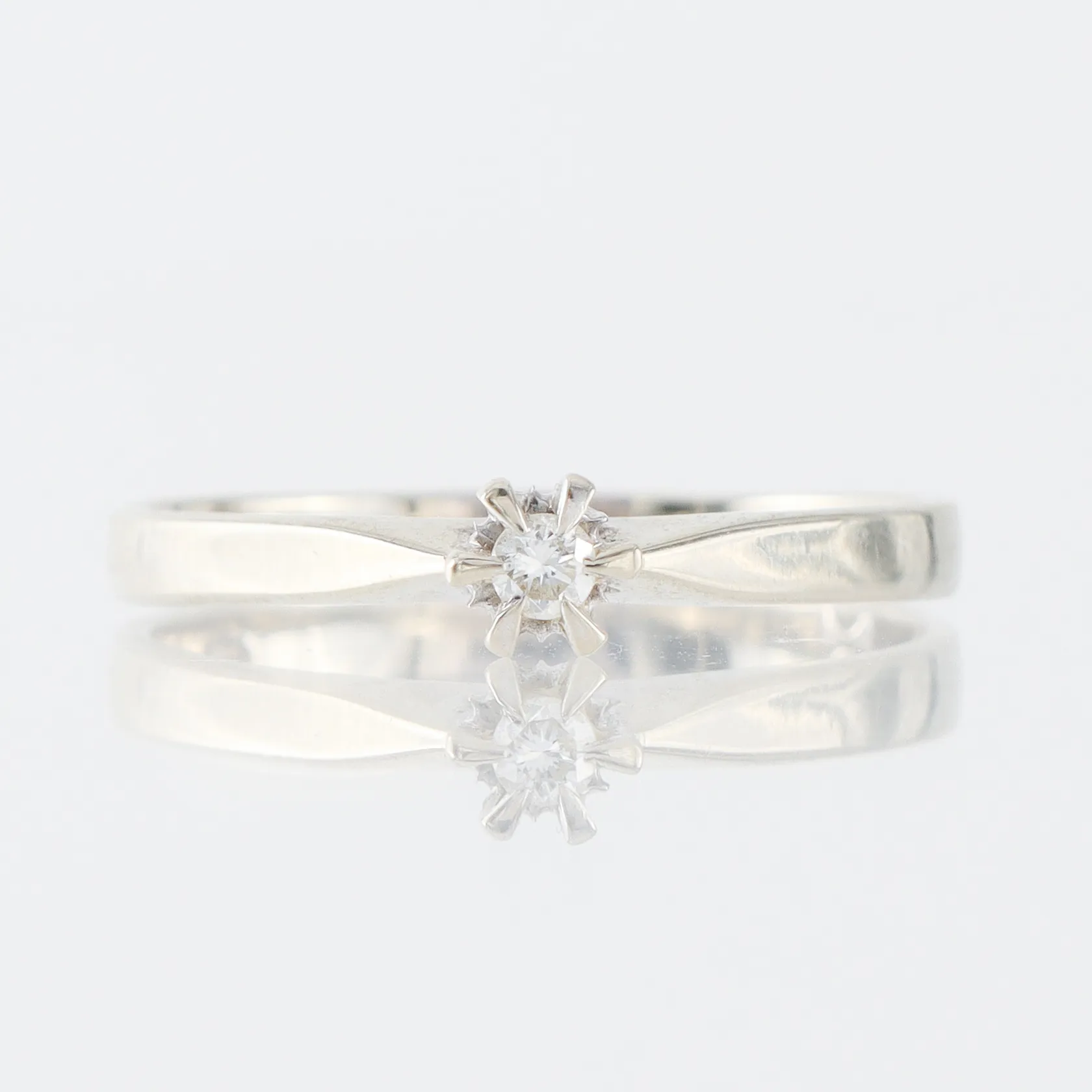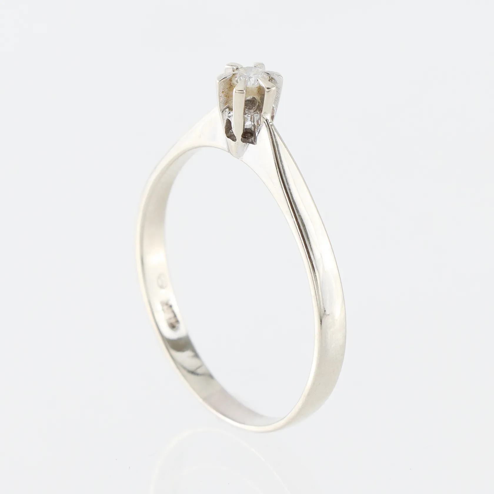 Diamantring med solitär diamant på 0.06 ct enligt inskription, storlek 18 ¼ mm, bredd 2.3-4.2 mm,18k vitguld. Vikt: 2,3 g.
