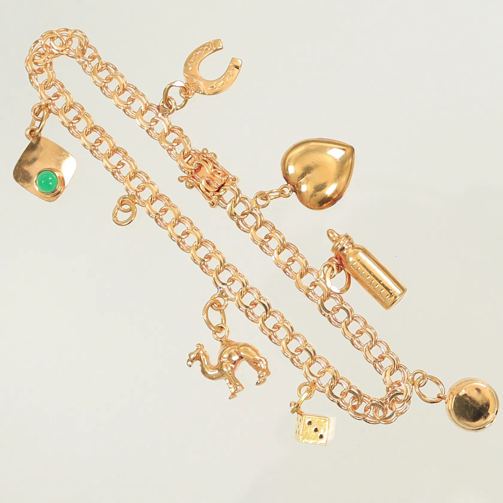 Armband bismarck med 7 berlocker varav en med grön sten, saknar berlock nr 8, 17,5cm bredd 4,5mm, 18K Vikt: 11,3 g.