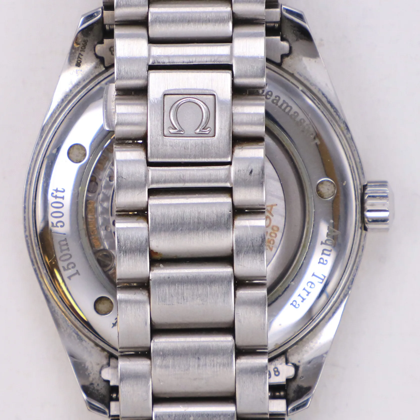 Herrur Omega Seamaster co-Axial AquaTerra, stål, automat, Ø39mm, ref-nr 25038000, cal 2500, serie-nr 80771068, stållänk, två extra länkbitar, glasbaksida, certifikat dec 2004, piktogram, chronometercertifikat, box saknar invändig del