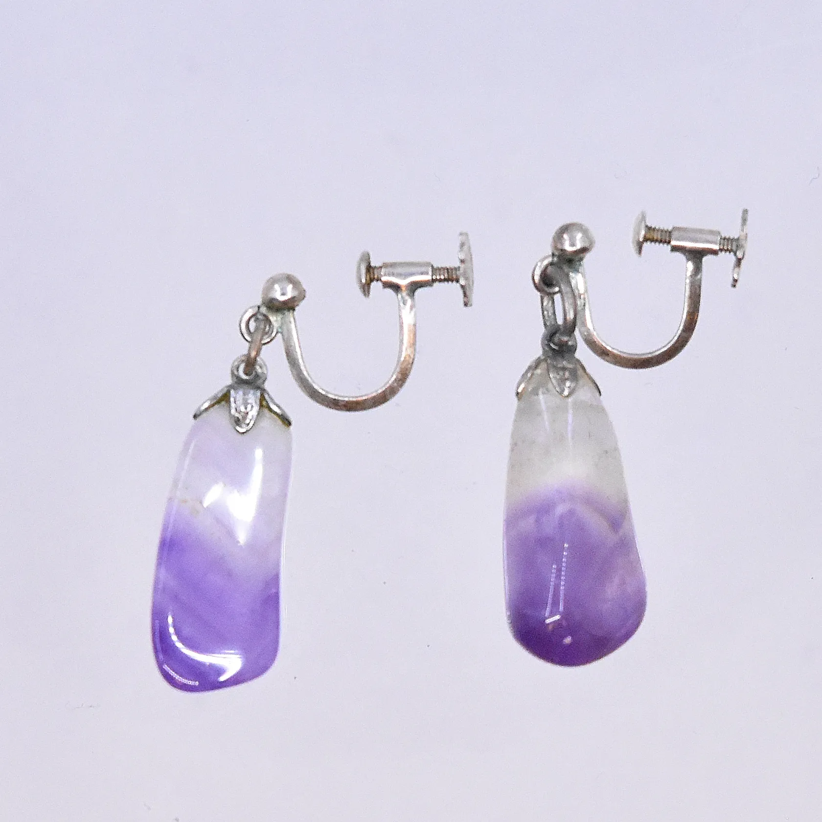 Ett par örhängen med lila sten och skruvlås, längd 32 mm, bredd 10 mm, silver 925/1000. Vikt: 5,9 g.