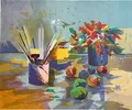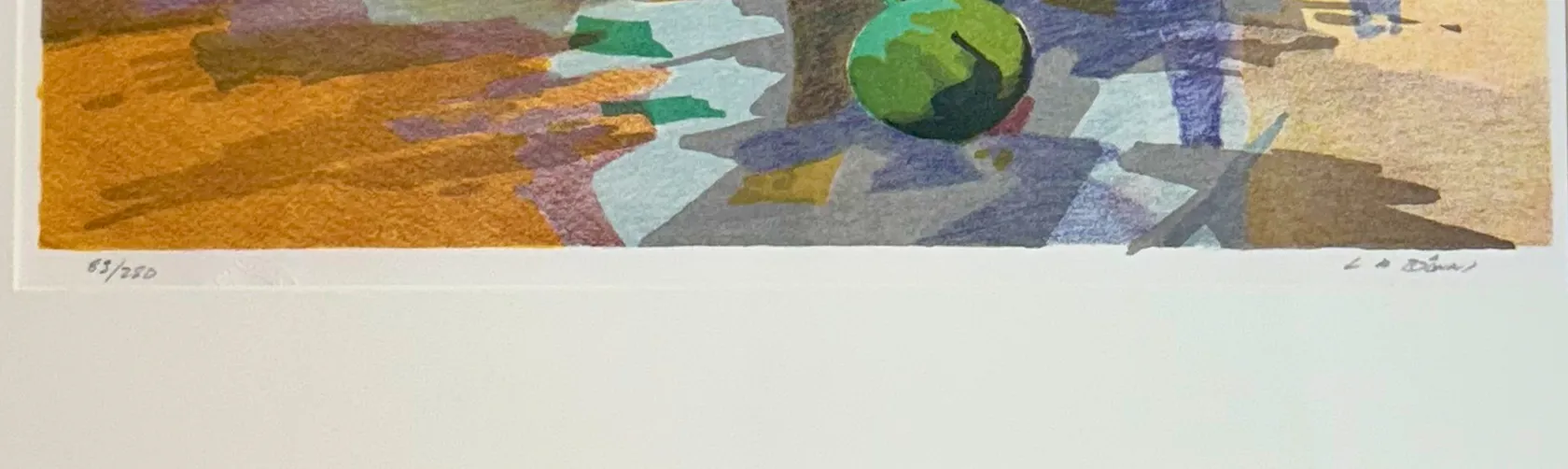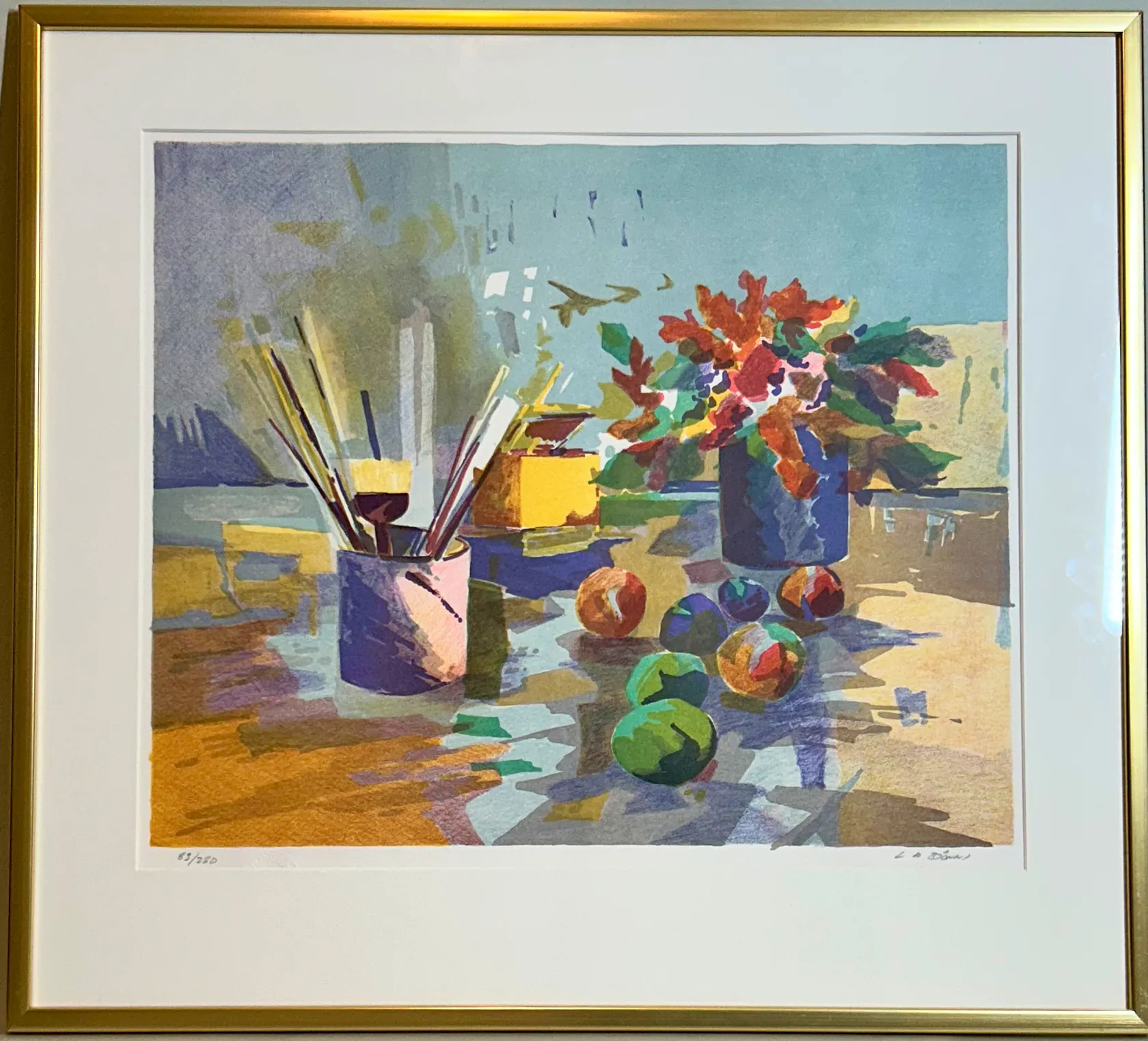 Tavla målarbänk Lars Andersson Bjönni, signerad litografi 83/280, 40 x 48cm, glas & ram Skickas med postpaket.