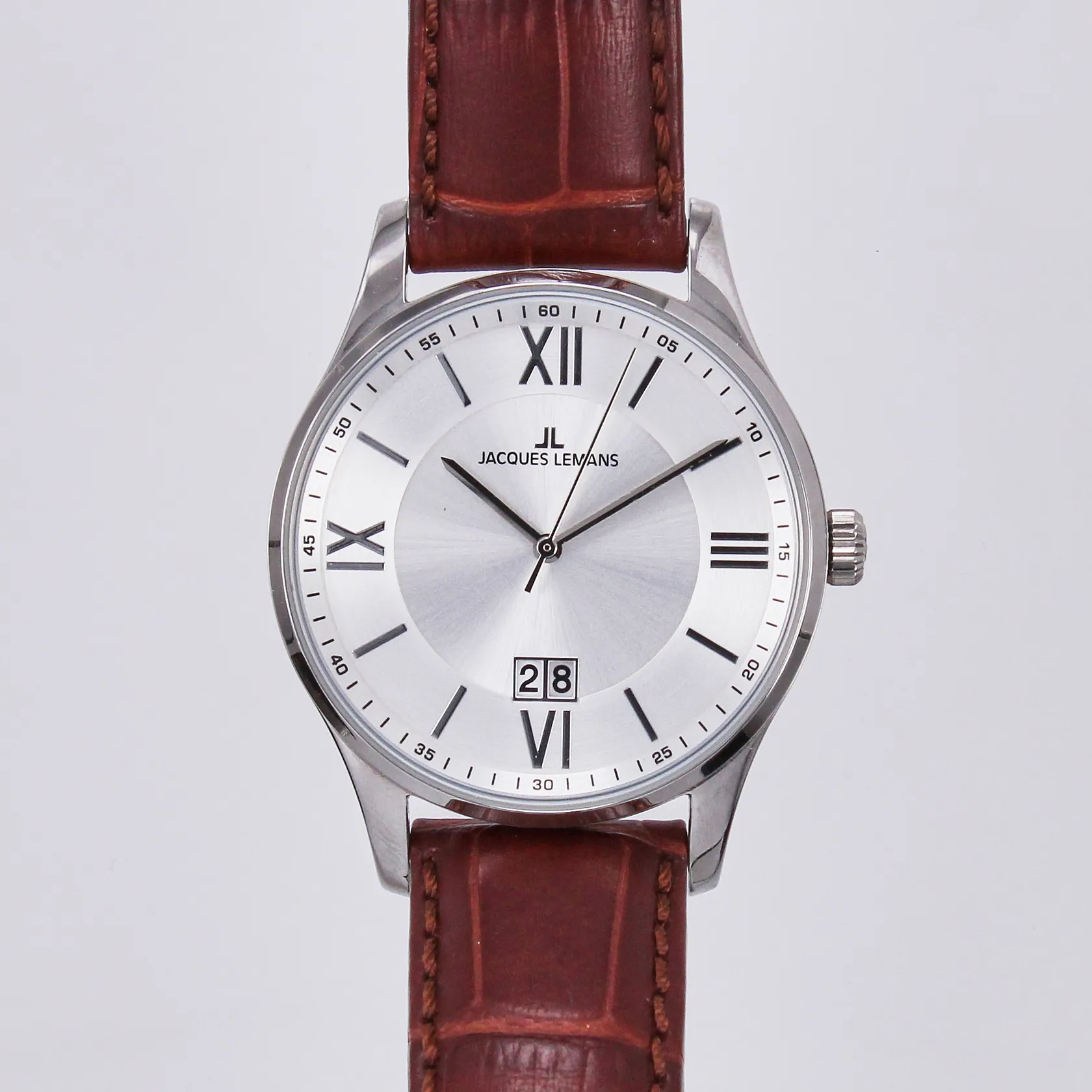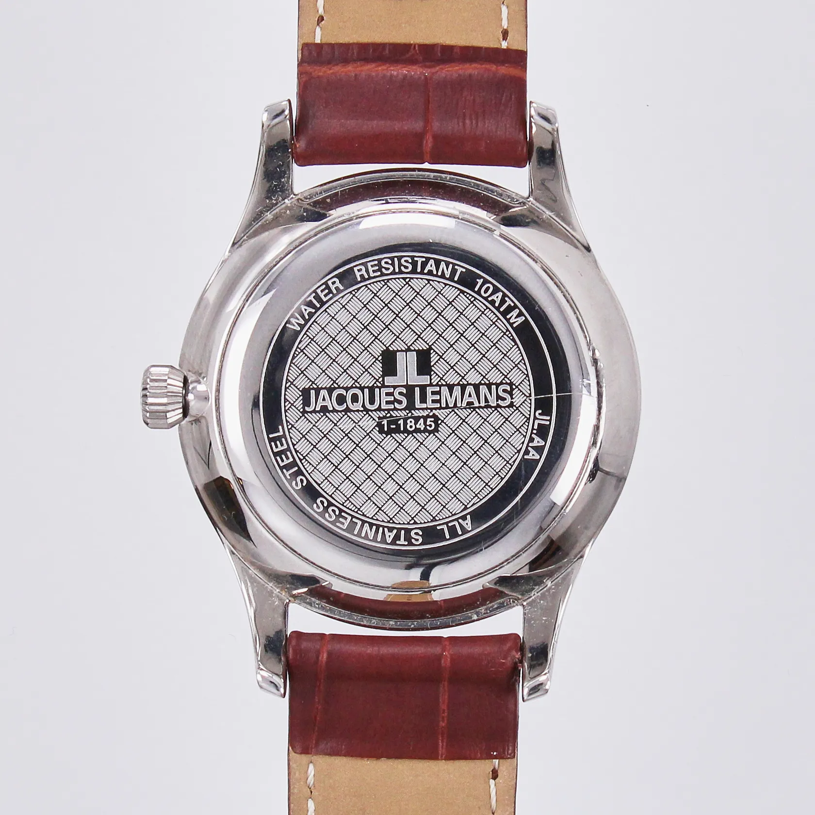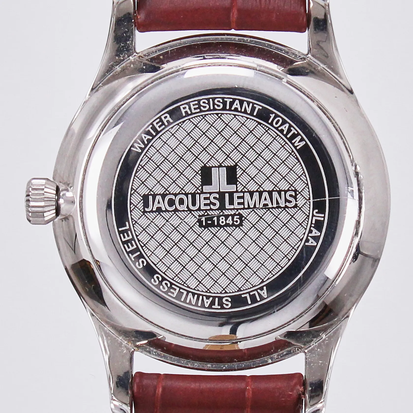 Herrur Jacques lLemans, quartz, modellnr 1-1845, stål, repa på baksida, med läderband, ej använd, behov av batteribyte, inga tillbehör